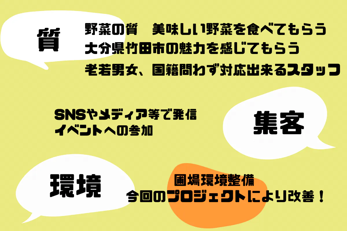 これも全て人口の減少や農家の高齢化、販路の少なさが原因であると思いこの竹田市に"人が集まる農園を作りたい"と考える様になりました。