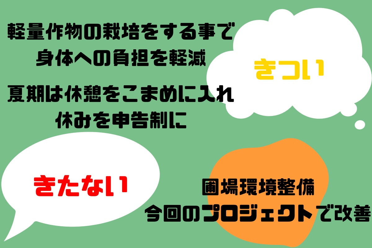 また"魅力的な農業"に近づける為にはどうしたら良いかと従業員や第三者に聞いた所、農業のきつい、きたないという2点のイメージを改善する必要があると考えました。
