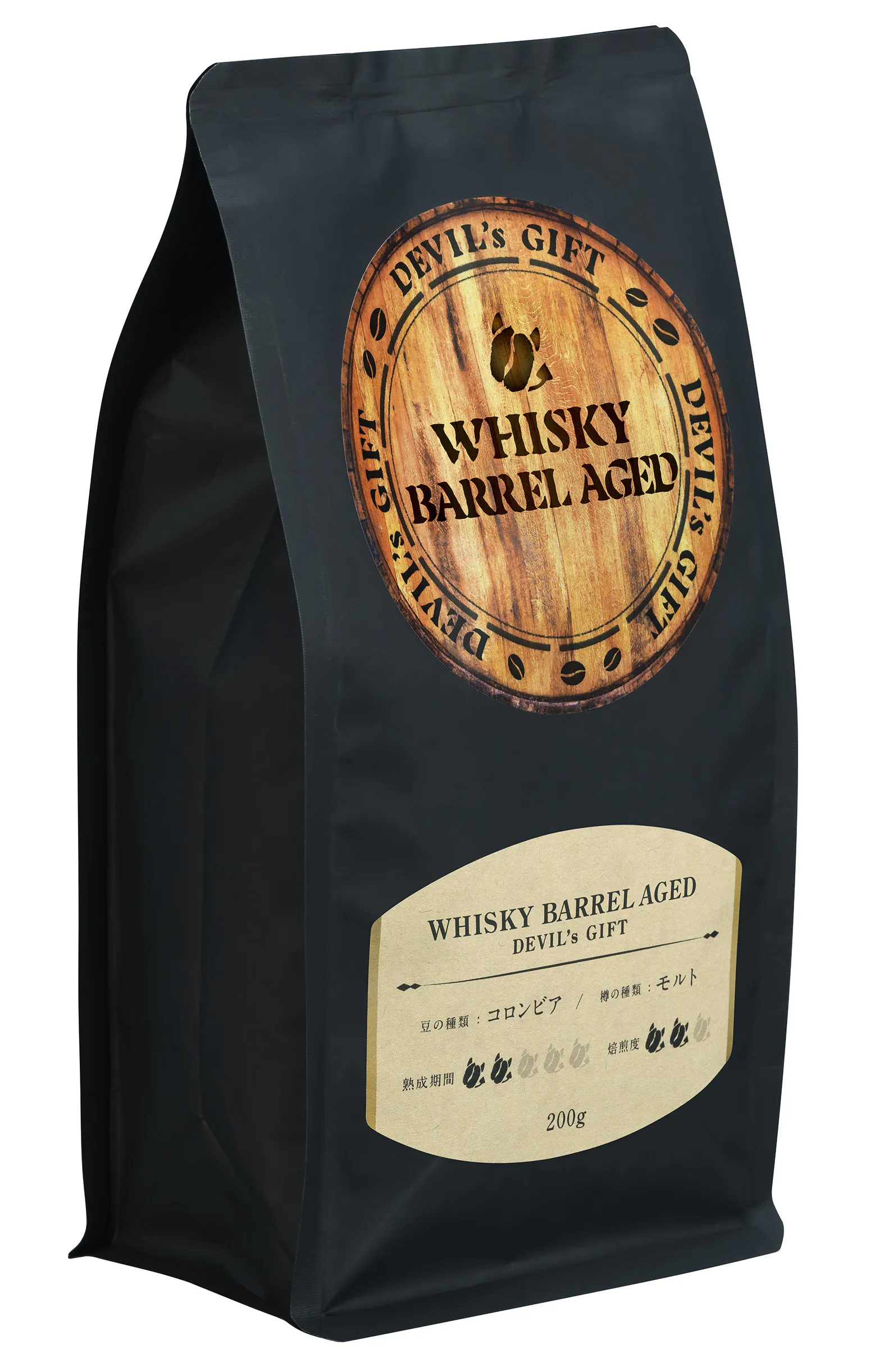 この樽にコーヒー生豆を入れて、じっくり熟成させることで、コーヒー豆に香りが移り、さらに焙煎することで驚くほど豊かな香りが楽しめるコーヒーに仕上がります。いわば、「悪魔からのおすそ分け」を受けてつくったコーヒー豆ですね。なお、この商品の商品名「デビルズ・ギフト」は「悪魔からのおすそ分け」をイメージして付けました。また、本商品のラベルに掲載されているマスコットキャラクターは「コーヒーデビルちゃん」です。ウイスキー樽にすみつき、仕込んだコーヒー豆に豊かな香りを届けてくれるかわいらしい悪魔をイメージしてデザインしました。