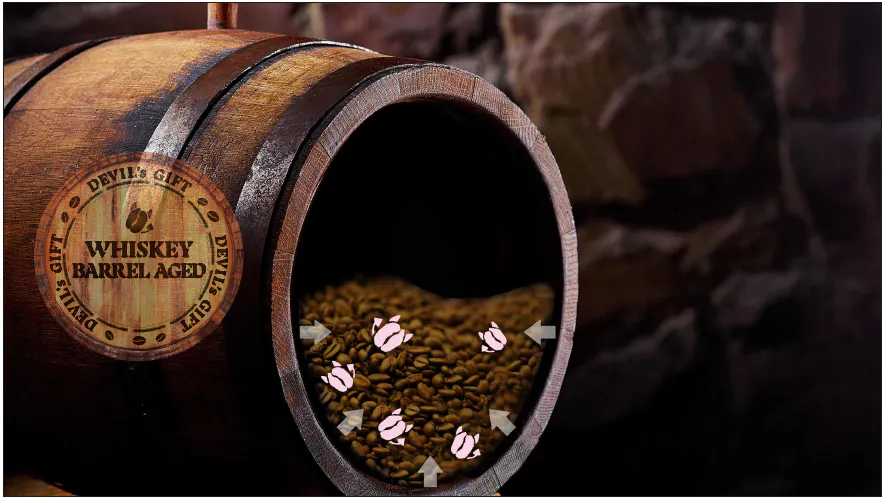 わたしたちは【ウイスキーバレルエイジド デビルズ・ギフト】を製造するために、コーヒー豆を熟成させるための樽の調達やコーヒー豆の焙煎工場との連携など誠心誠意プロジェクトを進めています。
