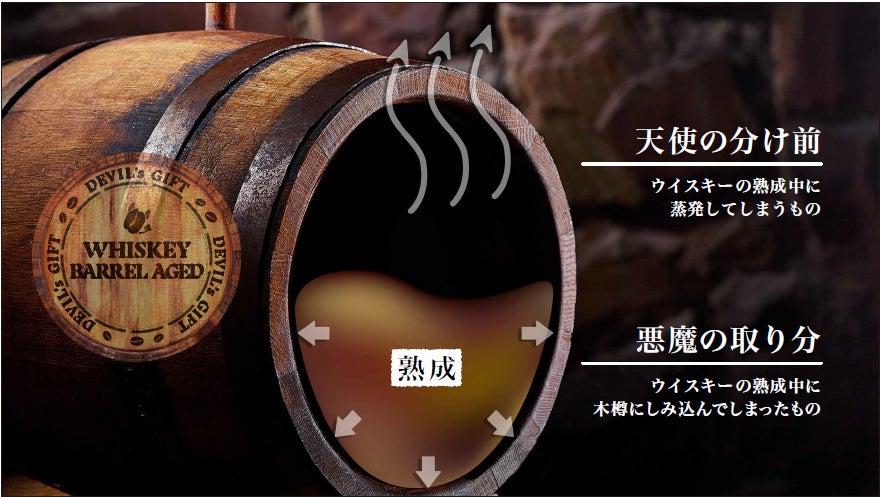 ウイスキーは何年も樽の中で熟成させることで、味わいや香りが豊かに変化していくお酒です。ウイスキーを熟成する過程で、樽自体にもウイスキーが染みこみ、取り出せなくなる量が一定量存在します。この部分は「悪魔の取り分」と呼ばれています。