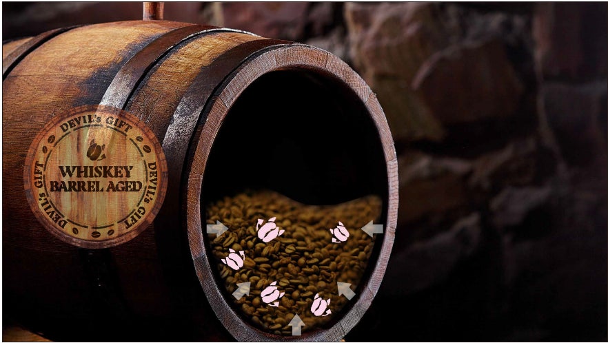 この樽にコーヒー生豆を入れて、じっくり熟成させることで、コーヒー豆に香りが移り、さらに焙煎することで驚くほど豊かな香りが楽しめるコーヒーに仕上がります。いわば、「悪魔からのおすそ分け」を受けてつくったコーヒー豆ですね。なお、この商品の商品名「デビルズ・ギフト」は「悪魔からのおすそ分け」をイメージして付けました。また、本商品のラベルに掲載されているマスコットキャラクターは「コーヒーデビルちゃん」です。ウイスキー樽にすみつき、仕込んだコーヒー豆に豊かな香りを届けてくれるかわいらしい悪魔をイメージしてデザインしました。