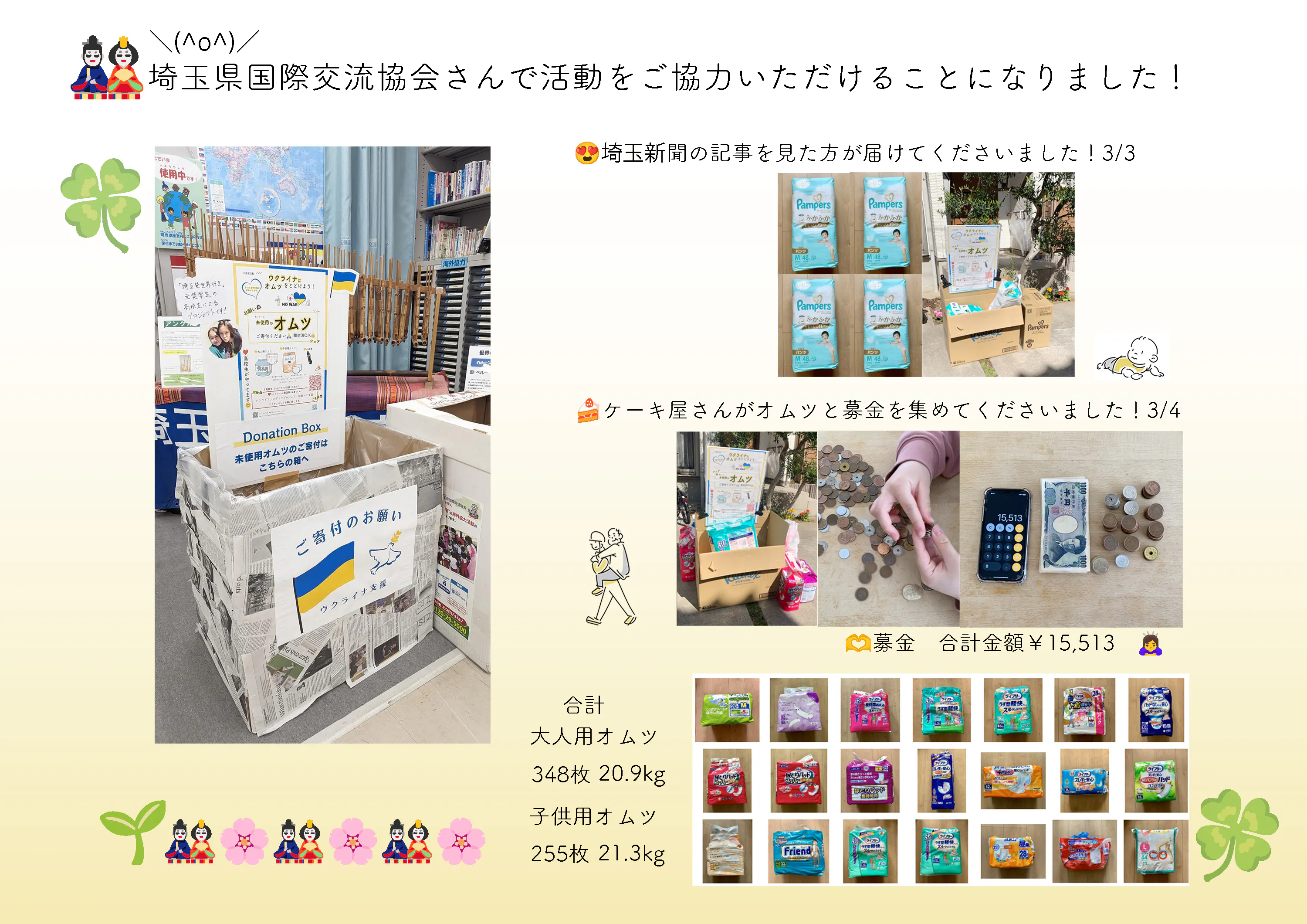 先月から北浦和にある埼玉県国際交流協会さんで、オムツを集める場所のご提供と募金活動をご協力いただけることになりました!埼玉県国際交流協会さんは、私がエストニアに留学をした際に「埼玉発世界行き」で冠奨学金をいただいた際にお世話になり、 帰国後、この活動についてご相談をしたところ、ご協力をいただけることになりました。 埼玉県国際交流協会さんありがとうございます!