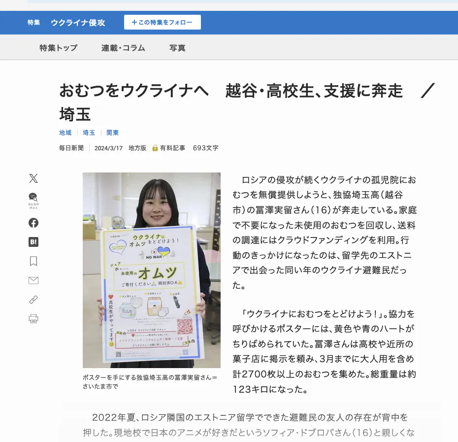 毎日新聞 おむつをウクライナへ 越谷・高校生、支援に奔走 /埼玉