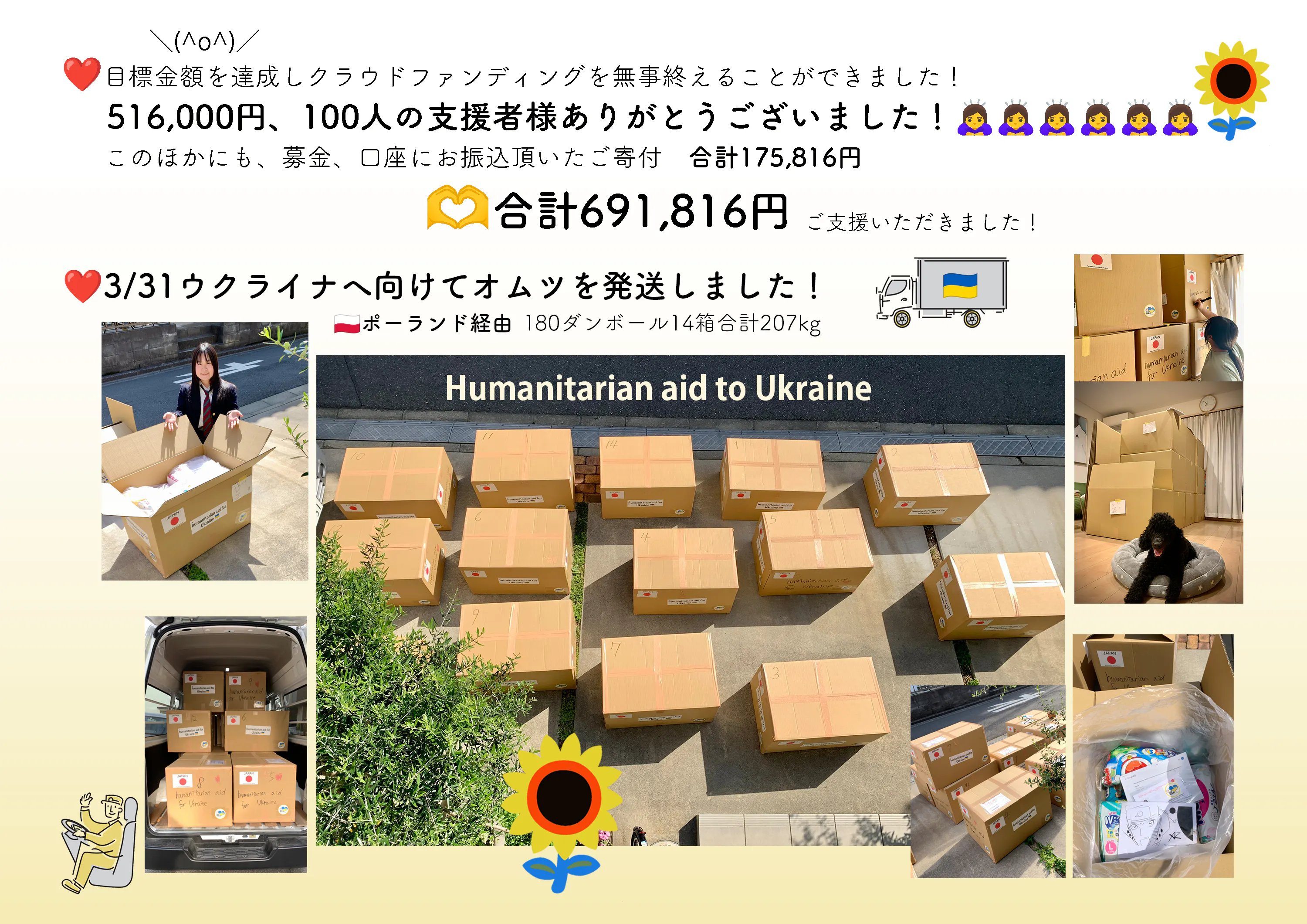 3/31、目標金額を上回りクラウドファンディングを無事終えることができました!516,000円、100人の支援者様、拡散してくださった皆様、本当にありがとうございました!この他にも募金で集まったご寄付と3名の方からの口座へのお振込み合せ175,816円集まりました。