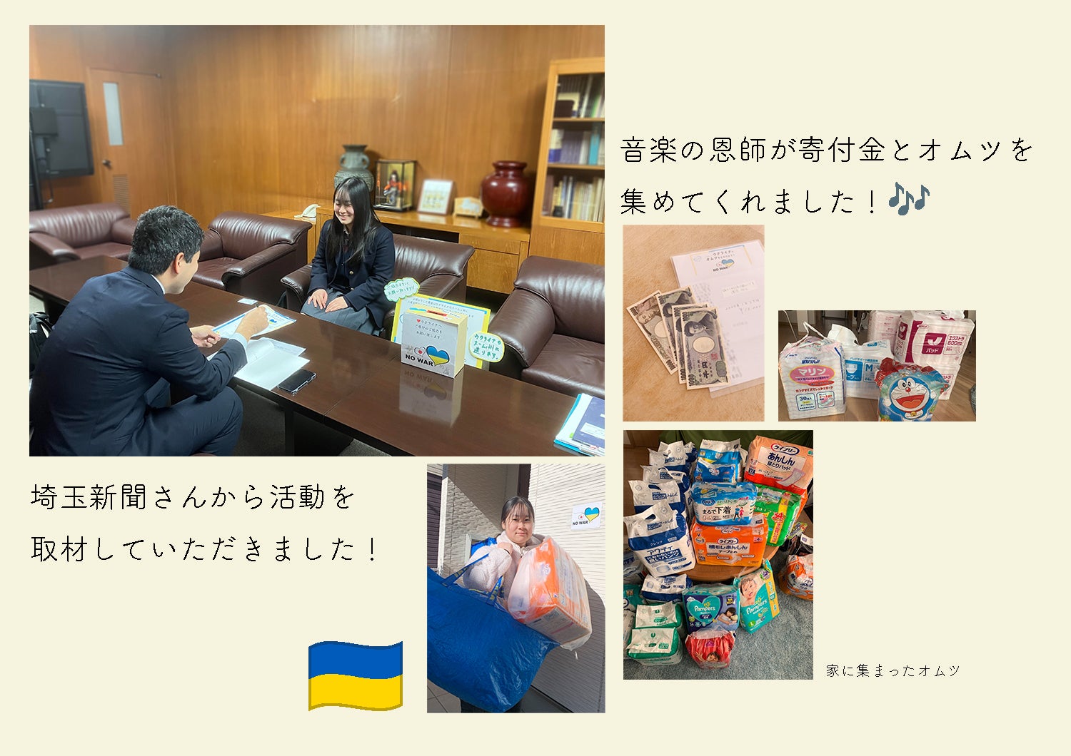 帰国後、日本の高校に復学した私は、高校生として何かできることはないかと模索しました。まず、身の回りから集められる物資はないかを探し、ポーランド在住のウクライナ支援をする坂本龍太朗さんに尋ねました。そこで、今必要としている物資は大人用、子供用オムツ、止血バンドであることを知りました。戦争が始まってから、ウクライナは西部に比べ、東部地方や前線近い地域では物資が不足しておりスームィ州もその一つで今までも支援が届いていない地域です。そこで、私は、身近から未使用で余っているオムツや止血バンドを集め、ウクライナ、スームィ州のБлагодійний фонд ЗА ЄВРОПЕЙСЬКЕ МАЙБУТНЄ(欧州の未来のための人道基金)が運営する孤児院ウリャニフスシカ特別学校へ寄贈をする活動を始めることを決意しました。こちらの孤児院は坂本さんを通して紹介いただき、私が物資を寄贈する許可を承諾頂いています。2022年の2月に始まったロシアによる侵攻は、誰もがまさかの戦争と注視しすぐ終わるだろうと思いました。私は、その年留学しましたが帰国後も戦争は続いています。ウクライナの人が自国で安心して暮らす日がいつになるか分かりませんが、必ず終わりが来て復興もあると信じ、微力ながらも持続可能な支援を続けたいと思い活動を始めました。