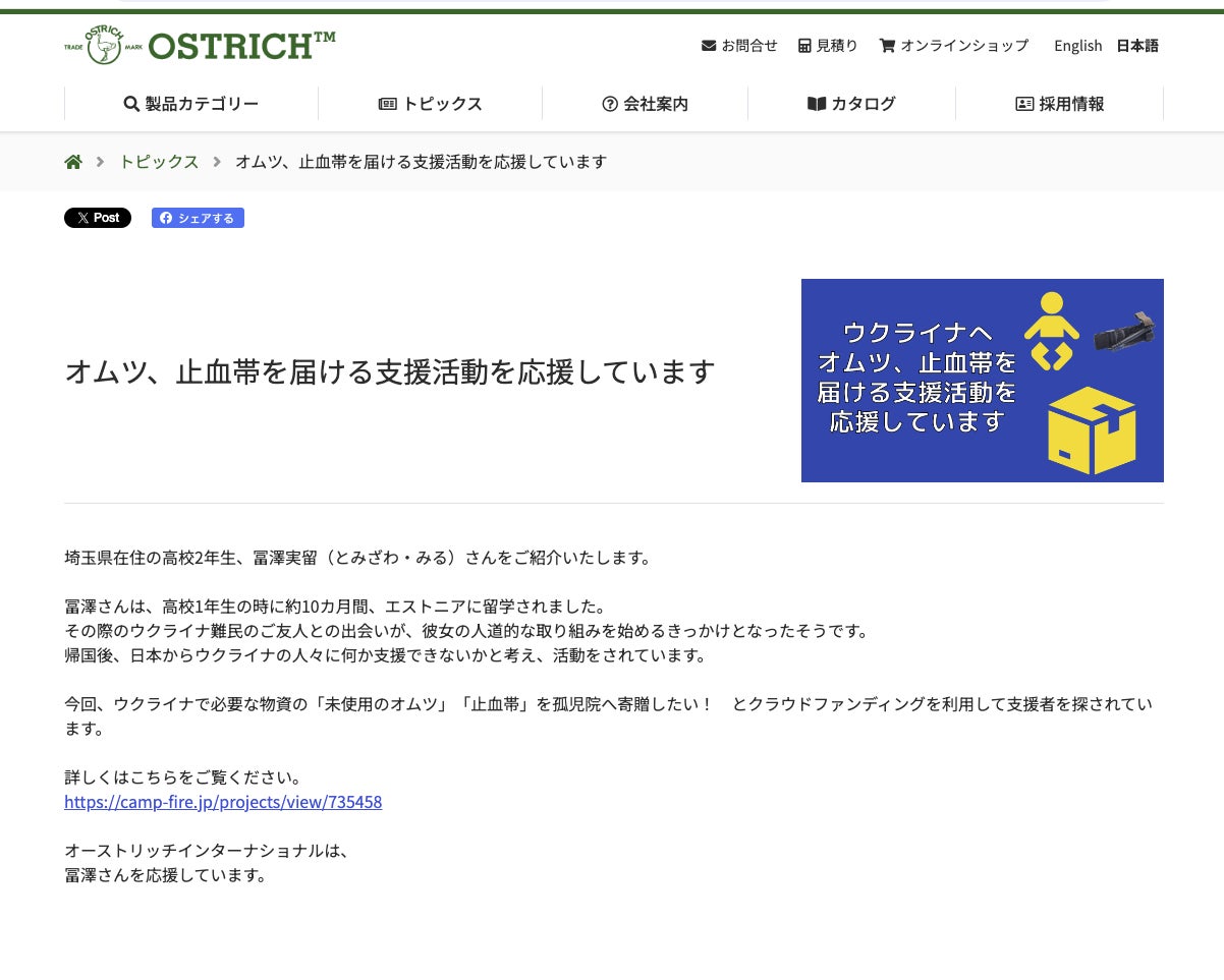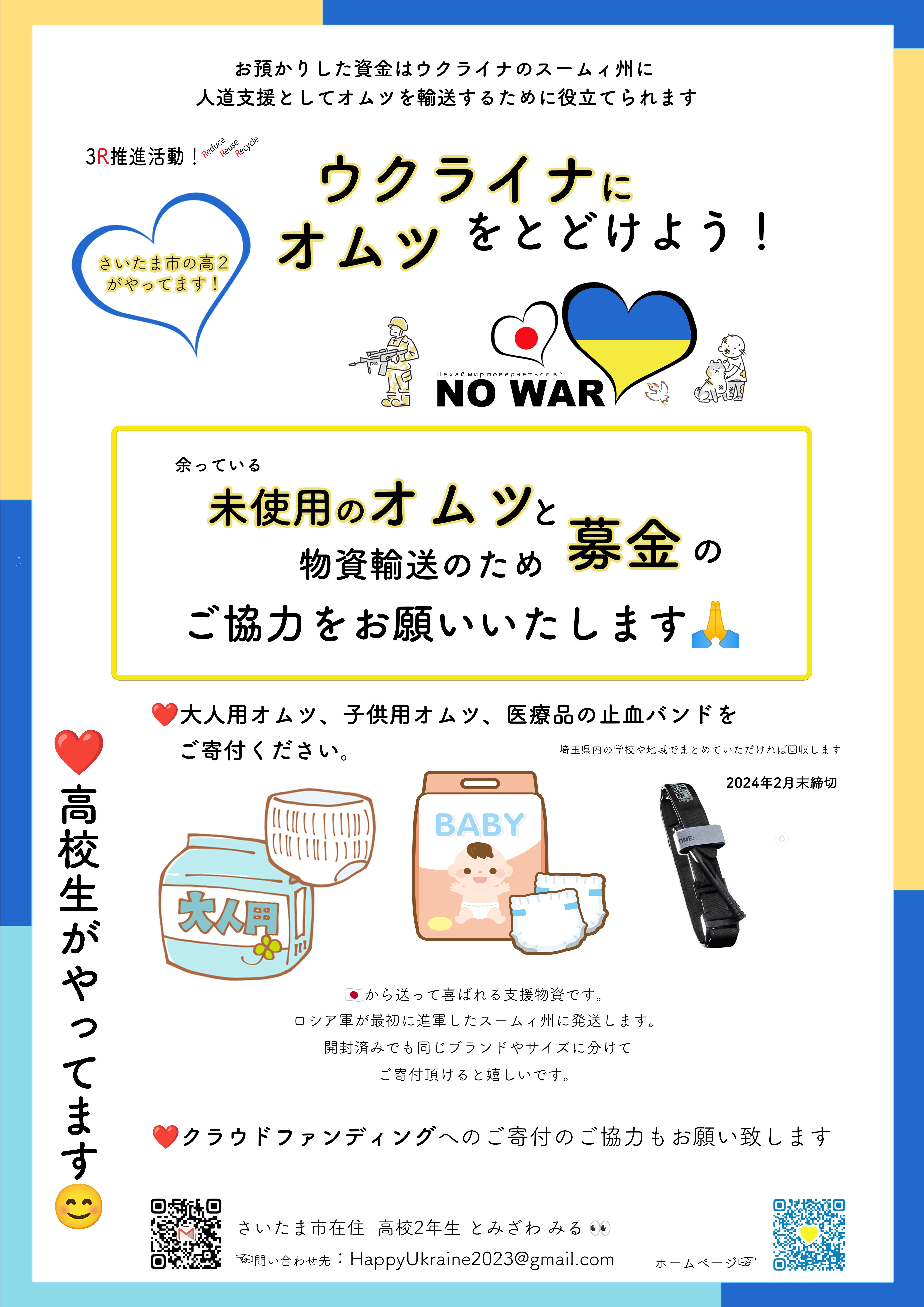 私は、高校1年生の約10ヶ月間、エストニアに留学した際に、ウクライナ難民の友人ができたことをきっかけに、帰国後、日本から何かウクライナの人達に支援ができないかを模索してきました。現在必要な物資が未使用のオムツや止血帯などであることを知り、ウクライナ、東部スームィ州の孤児院へ寄贈したいと思い活動しています。