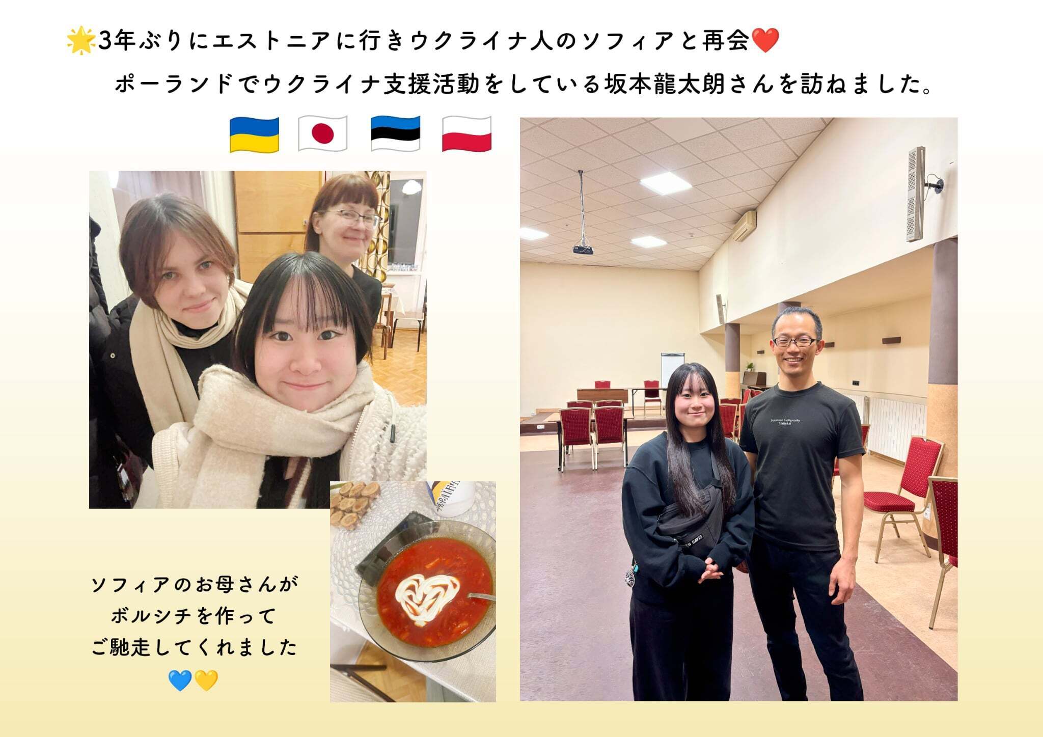 2026/03/02 17:26ポーランドでウクライナ支援家の坂本さんにお会いしました。坂本さんからは、現在のウクライナの状況や支援活動の現実について直接お話を伺うことができました。特に印象的だったのは、ウクライナの人々はすでに自立し始めており、4年前と比べて必要としているものも変化しているということです。単に物資を送るだけではなく、現地の人々の状況やニーズを正確に理解し続けることが重要であると感じました。また、必要な物資を調べ、集め、送ってから現地に届くまでには時間がかかり、その間にも状況が変わることや、リアルタイムの情報を収集し、本当に必要とされている支援を届けることを考えると、支援難しさを改めて思い知り、支援活動の奥深さと責任の重さを改めて実感しました。また、エストニアでは留学時代のウクライナ人の友人とも再会しました。彼女は現在もエストニアで学生として生活しており、4年前よりもエストニア語が流暢になり、とても逞しく成長していました。その姿を見て安心する一方で、14歳から18歳という人生の中でも特に大切な時期を祖国で過ごせなかった事実を考慮すると彼女の辛さは計り知れないと思います。彼女は日本が好きで、日本に来たいという気持ちがありますが、それ以上に「ウクライナに帰りたい」と語っていました。その言葉から、祖国を想う気持ちの強さを改めて感じました。今回の旅行を通して、支援でただ物資を送るだけでなく、現地の人々の声に耳を傾け続けることが何より大切であると学びました。これからも、ウクライナに一日でも早く平和な日常が戻ることを願いながら、自分にできる支援を続けていきたいと思います。また、ご協力いただいているケーキ屋さんで、今回も多くの方に募金のご協力をいただきました。皆様の温かいお気持ちが、支援へと繋がっています。募金額8,563円引き続き、どうぞよろしくお願いいたします。 もっと見る