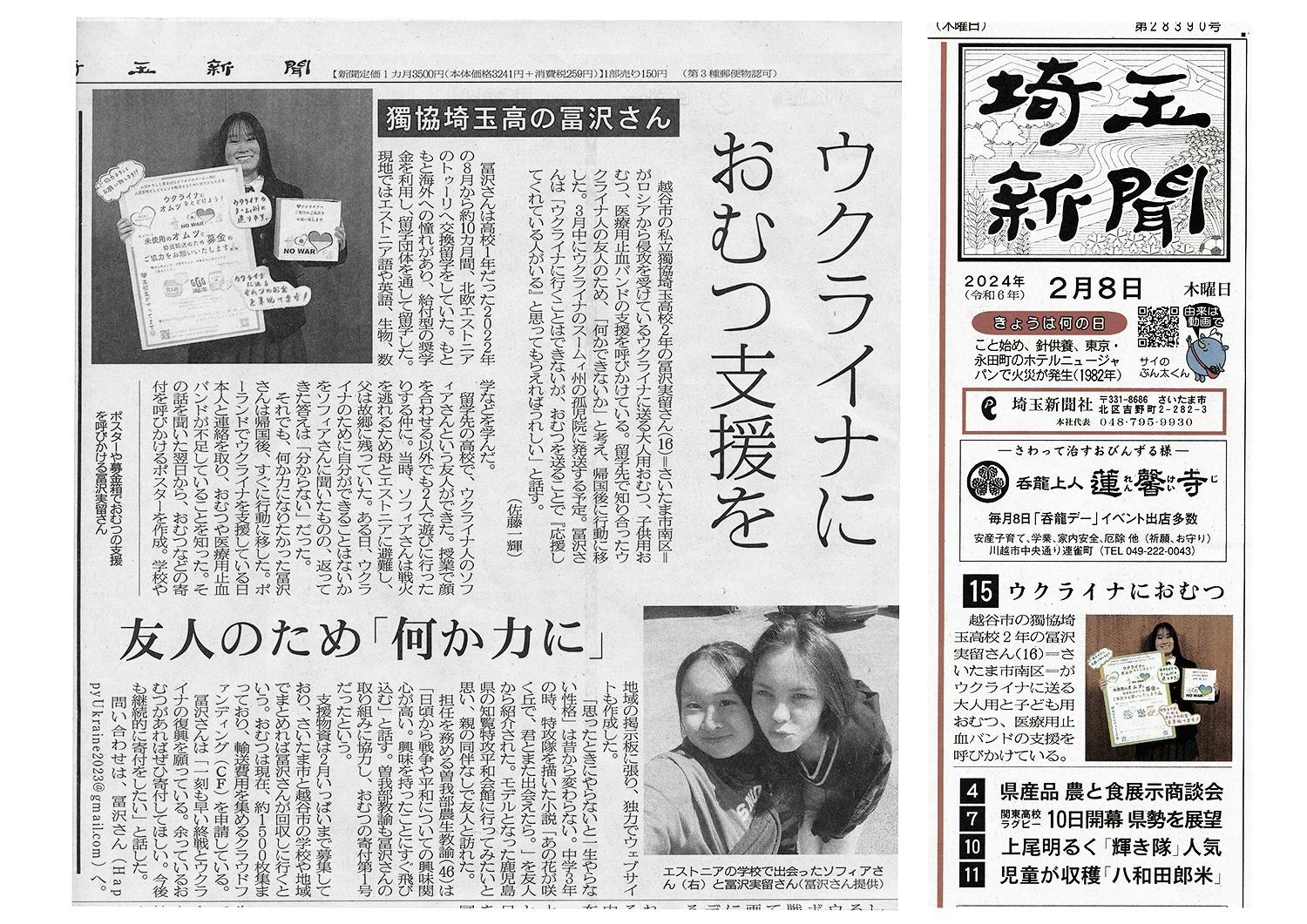 新聞表紙の見出しにカラー写真と紹介文がを載せていただき、記事にはウクライナ人の友達との写真もあり想像以上に大きく取り扱っていただきました。早速この記事をご覧いただいた方から、オムツを寄贈したいとご連絡を受けました。埼玉新聞さんありがとうございました。私の活動を多くの方に知ってもらうきっかけになると嬉しいです。