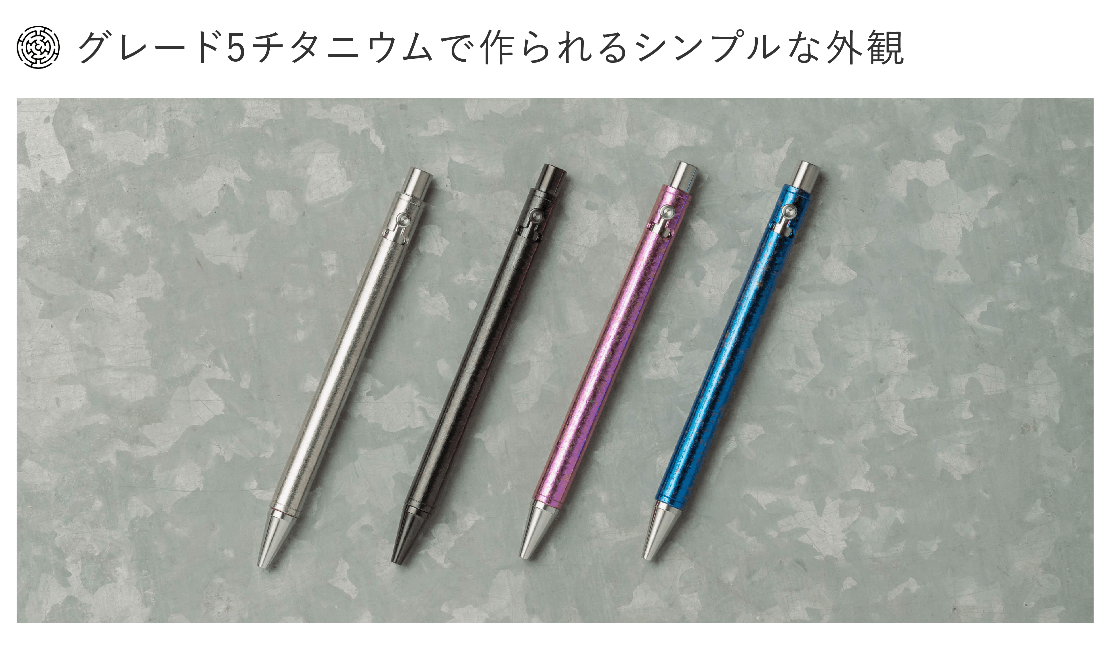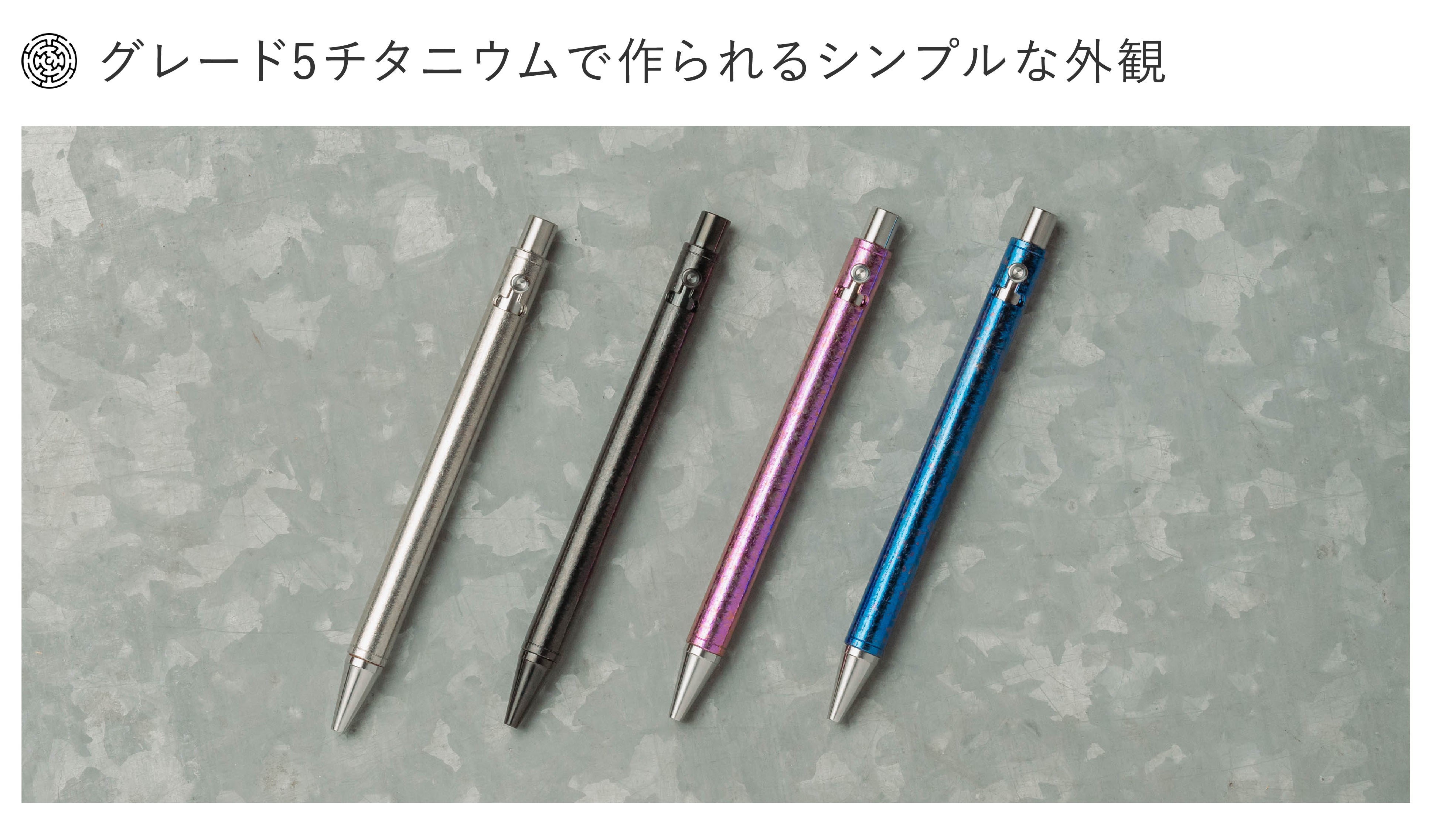 軽量で頑丈、錆びにくい、熱や腐食に強い、アレルギーが出づらいなどの特徴を持つチタンは、肌に触れる時間の多いペンには最適な素材です。