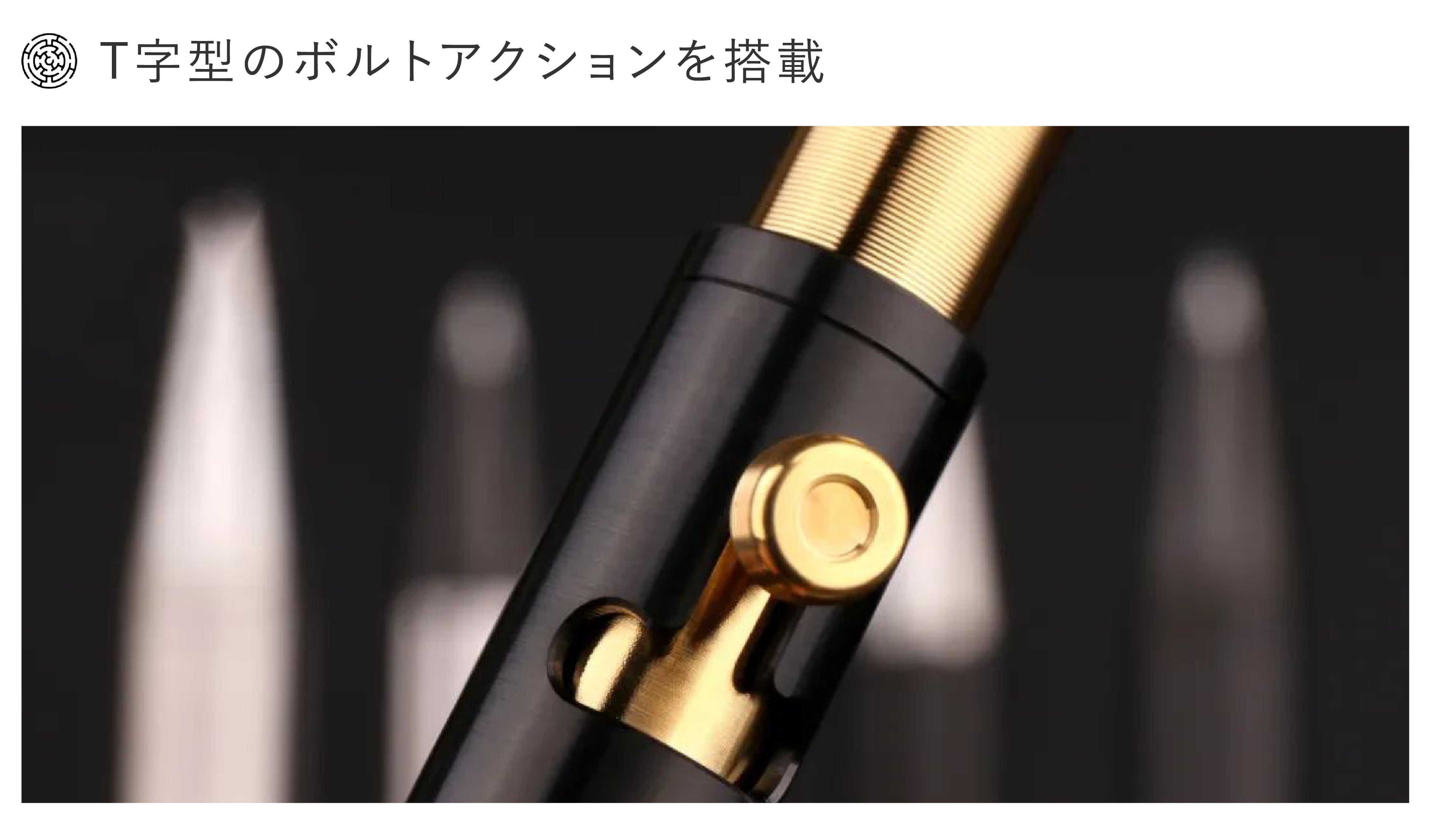 ライフルなどの銃弾を装填する「ボルトアクション」の動作を疑似体験できるギミックが特徴の「TP2」。