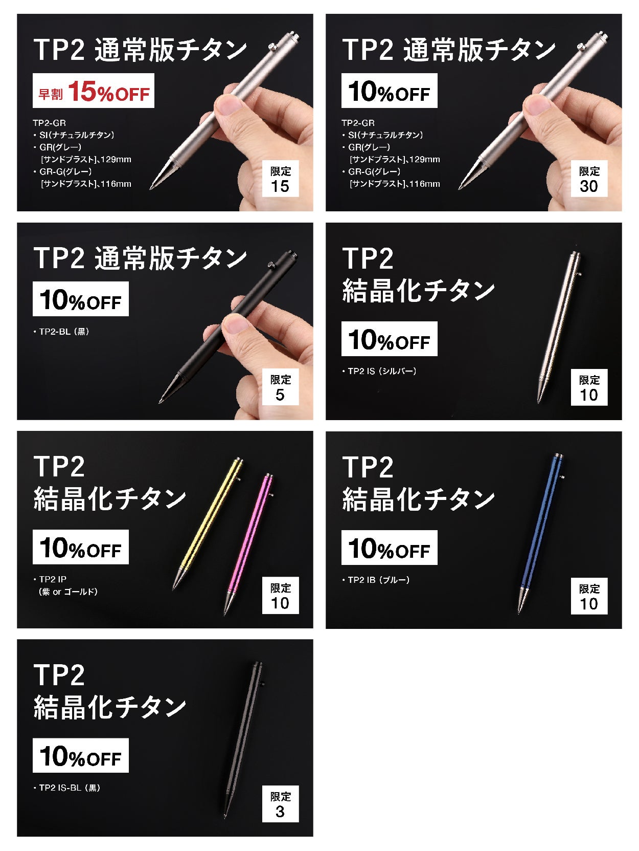 ※通常版チタンモデルのTP2のグレー[サンドブラスト]のみ、対応リフィルが異なるTP2-Gが選択可能です。TP2-Gのみ、対応するリフィルがParker社などからリリースされている約98mmのG2規格(国際規格 ISO12757-2のG2規格)のリフィルが対応します。