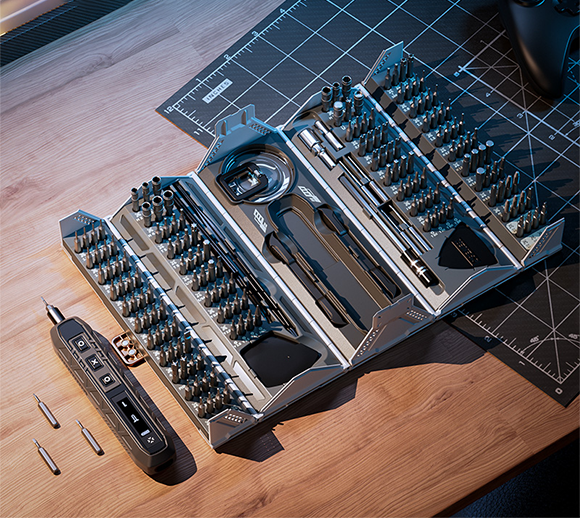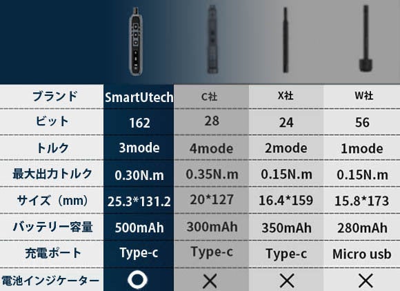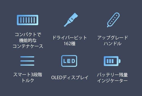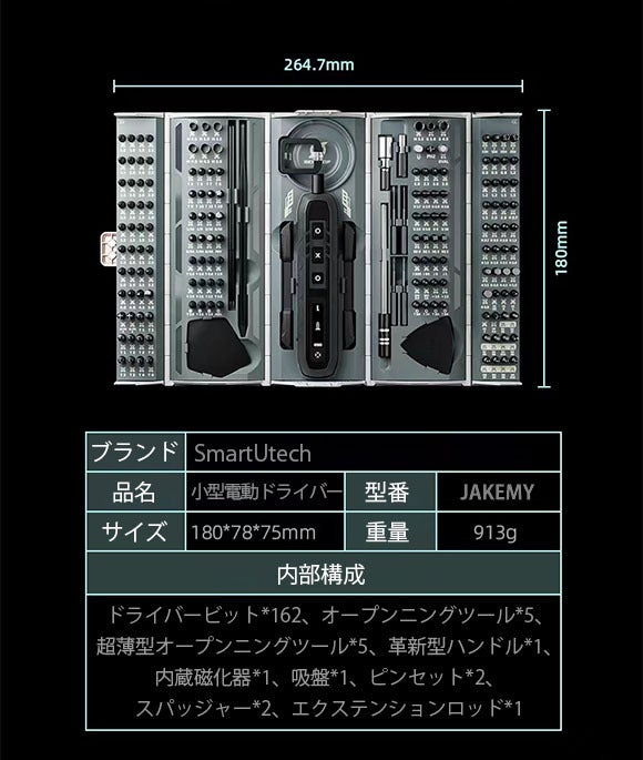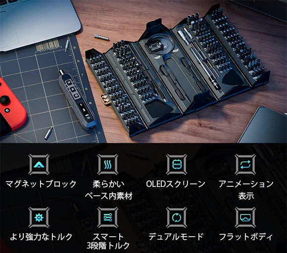 「SmartUtech」は、圧巻の162種のドライバービットを付属、3段階のトルク調整、OLED搭載、コンパクトなコンテナ型収納ケースと、利便性と機能性を追求した電動小型ドライバーです。