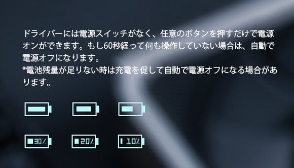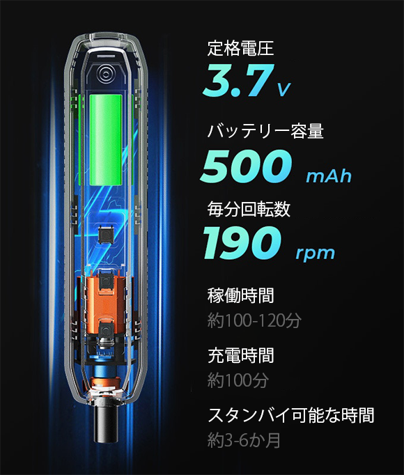 連続駆動時間 :約100-120分(約1000個のネジを締める、または外すことが可能)
