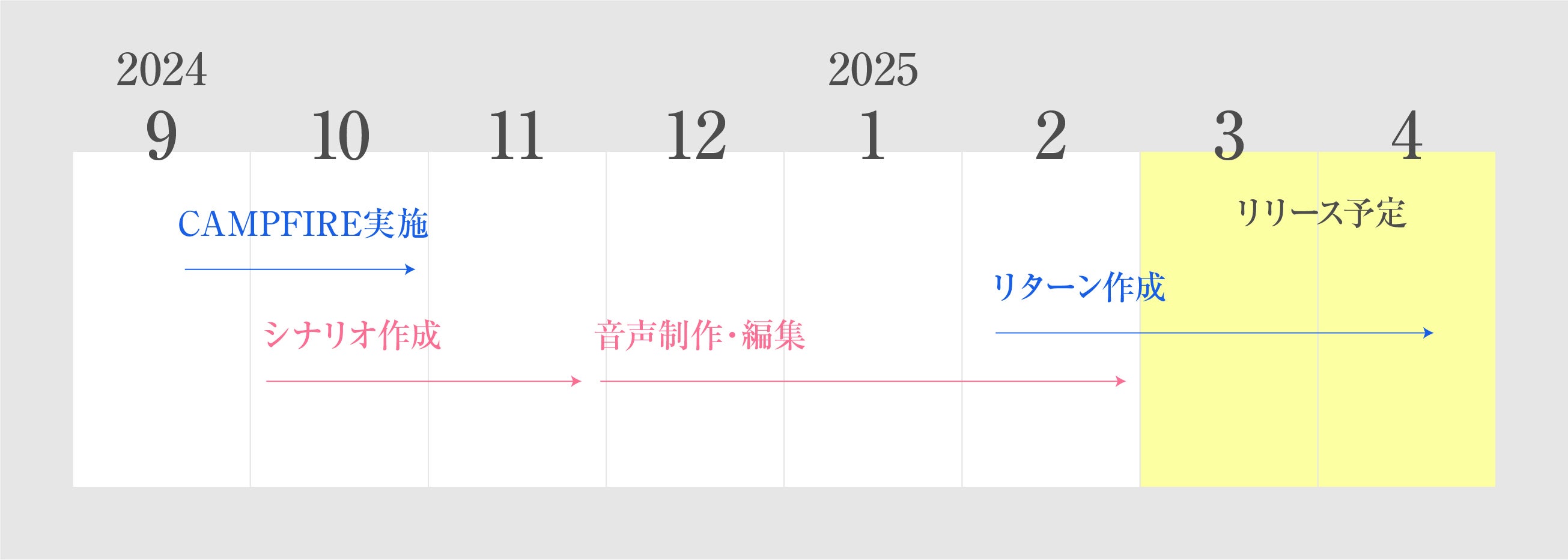 ※スタッフおよびキャストのサインが関連するリターンも同時期を予定しておりますが、スケジュール次第では上記より後ろ倒しになる可能性がございます。最新の進捗状況に関しては支援者様向けの制作日誌等で随時報告させていただきます。