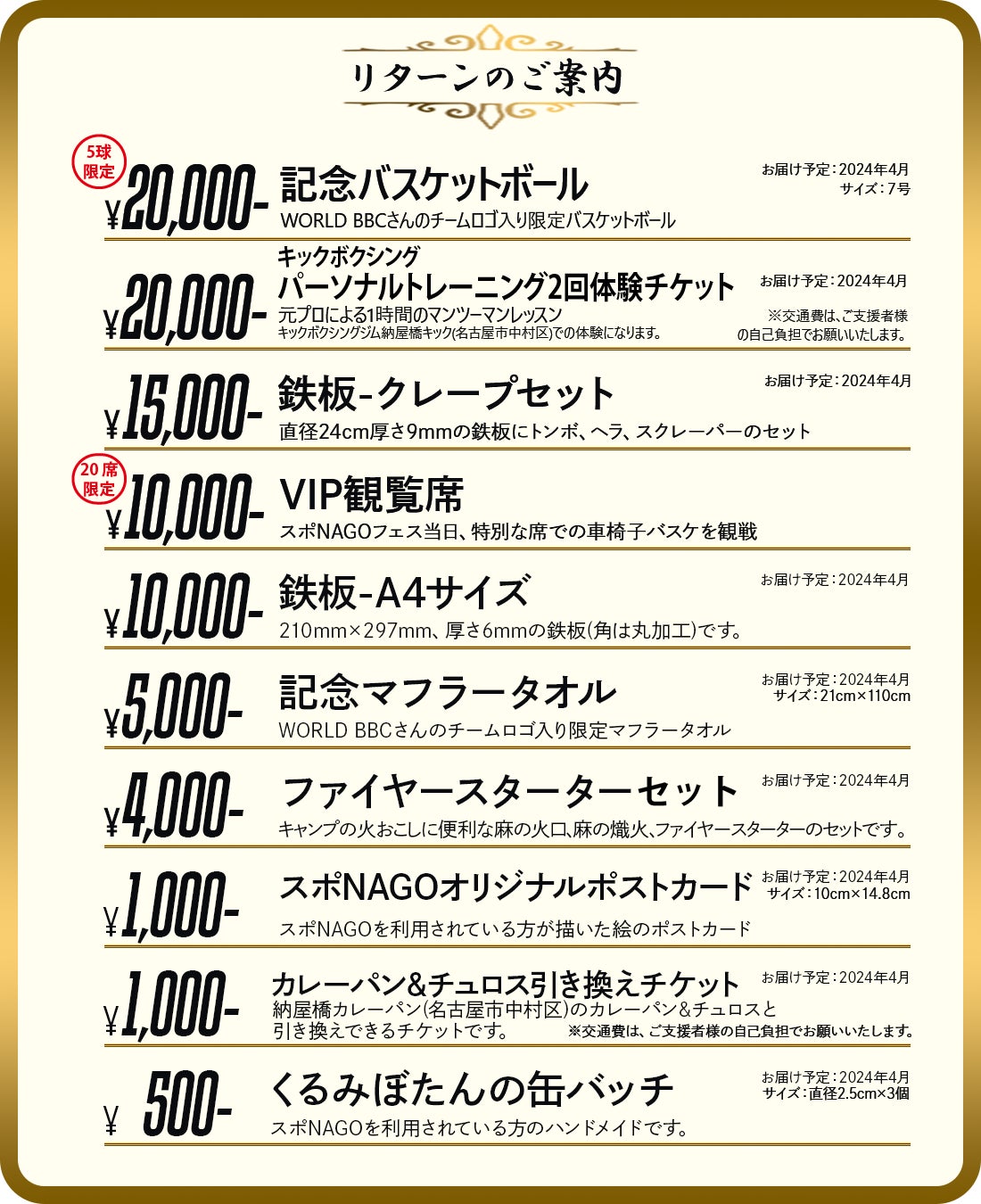 2024/04/05 13:47ご支援いただいた皆様この度は誠にありがとうございます。目標には届きませんでしたが188,500円と多額のご支援をいただき、心より感謝いたしております。3/16(土)にスポNAGOフェスを開催いたしました。たくさんのご来場者にお越しいただき、ゲストのYO!YO!YOSUKEさん、WORLD BBCさんをお迎えして大いに盛り上がりました。皆様に今一度多大なるご支援に対して感謝を申し上げます。返礼品は準備ができ次第順次発送いたします。 もっと見る