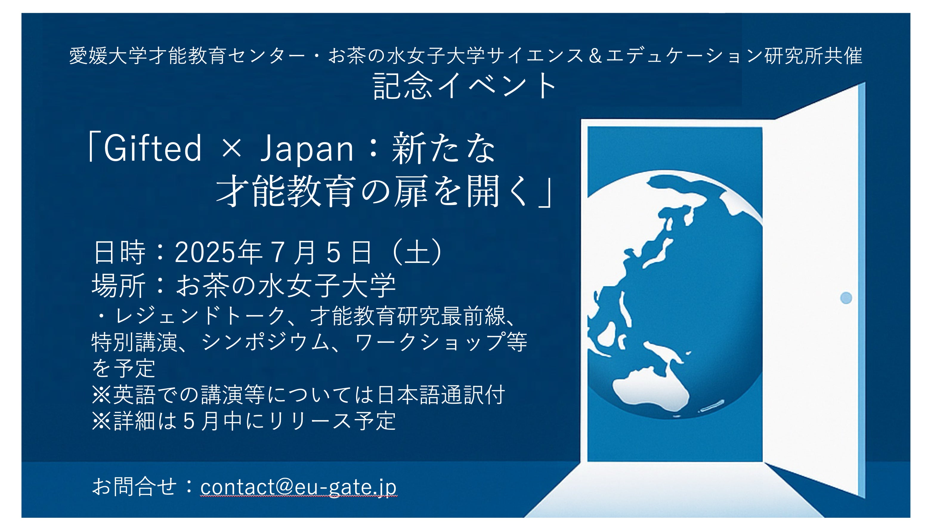そうした経験を踏まえ、愛媛大学才能教育センターとAPCG2024で副実行委員長を務められた千葉和義先生やユースサミット講師の先生方が所属されているお茶の水女子大学のサイエンス&エデュケーション研究所が共催し、2025年7月5日(土)に東京(お茶の水女子大学)にて才能教育研究イベントを開催いたします。才能教育センターのキックオフイベントであり、お茶の水女子大学の記念イベントでもあります。英語での講演等については日本語通訳がつきます。参加費無料です。ワークショップについては人数制限を行います。詳細は今月中に発表予定です。
