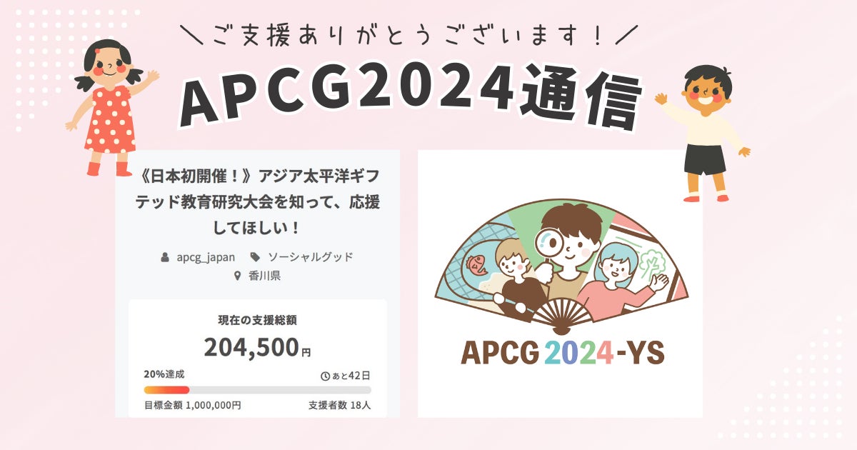 こんにちは!本日も温かい応援・ご支援をありがとうございます!クラウドファンディングがスタートして、2週間が経過しました。多くの方にご支援いただき、18名の方から合計で目標金額の20万円を超えるご支援をいただきました。心より御礼申し上げます。皆様からの温かい応援コメントや、プロジェクトへの共感の声もいただいており、大変励みになっております。本当にありがとうございます!皆様のご支援によって、より多くの方にギフテッド教育への取り組みを知ってもらい、才能ある子供たちが生き生きと輝く社会を実現できるよう、これからも活動を続けてまいります。引き続き、応援よろしくお願いいたします!◆APCG2024ユースサミットのロゴが決定しました!◆ユースサミットに参加してくれる日本の中学生がデザインしてくれました。ユースサミットで行う予定の活動が扇の中に描かれており、とても素敵なロゴに仕上がっています。ユースサミットの開催準備も、着々と進んでいます。今後のAPCGのお知らせもぜひ、楽しみにお待ちくださいませ!引き続きクラウドファンディングを頑張っていきますので、応援をよろしくお願いいたします。