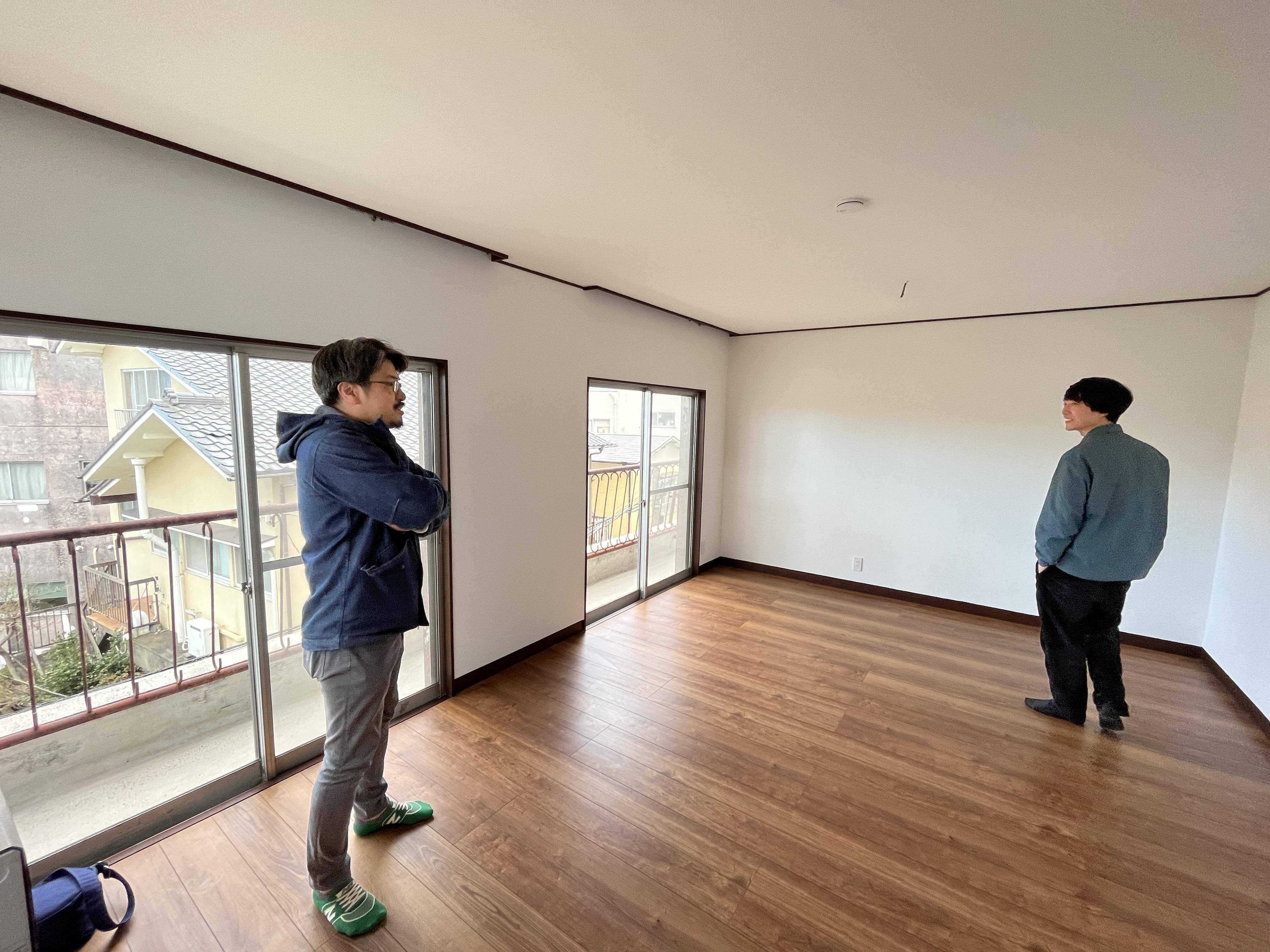 各部屋の照明はこれから取り付ける予定なのですが、この部屋は窓が大きく数も多いのでとにかく明るいです。写真の奥、荒武さんが立っているあたりにダブルベッドを2台設置予定です!