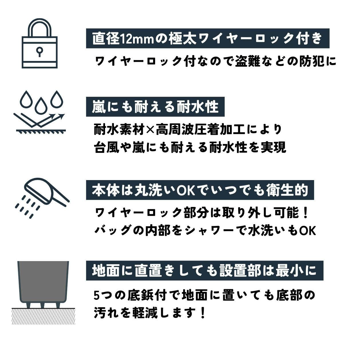 特許申請中の独自機構で、ワイヤーロック部分は簡単に取り外し可能。定期的にヘルメットバッグの内部を水で洗い流しすことができるので衛生的に使うことができます。また、取り外したワイヤーロックは単体で自転車のロックとしてご利用いただけます。