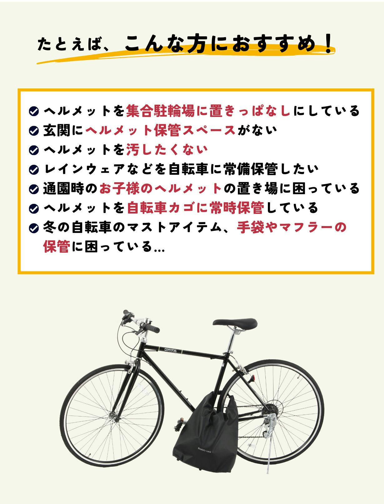 雨や盗難の心配を軽減しつつヘルメットの保管に便利です。スポーツ、シティサイクルなどあらゆる自転車に装着することができます。