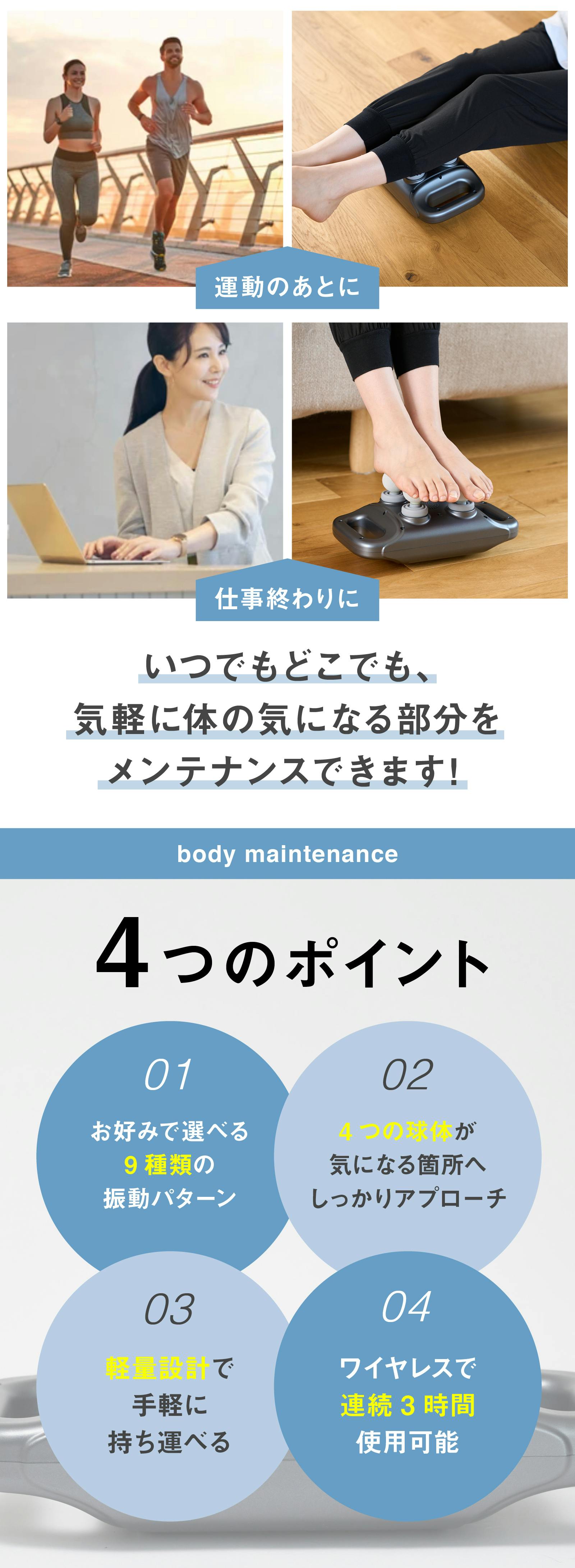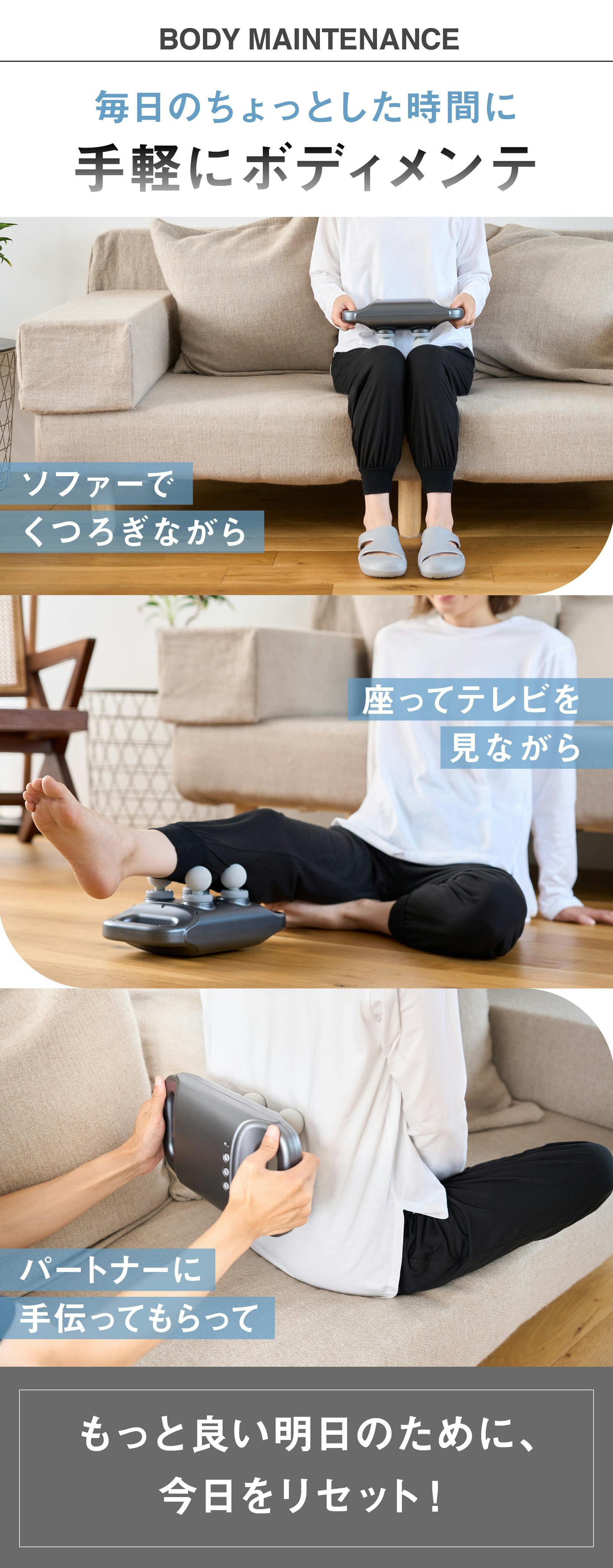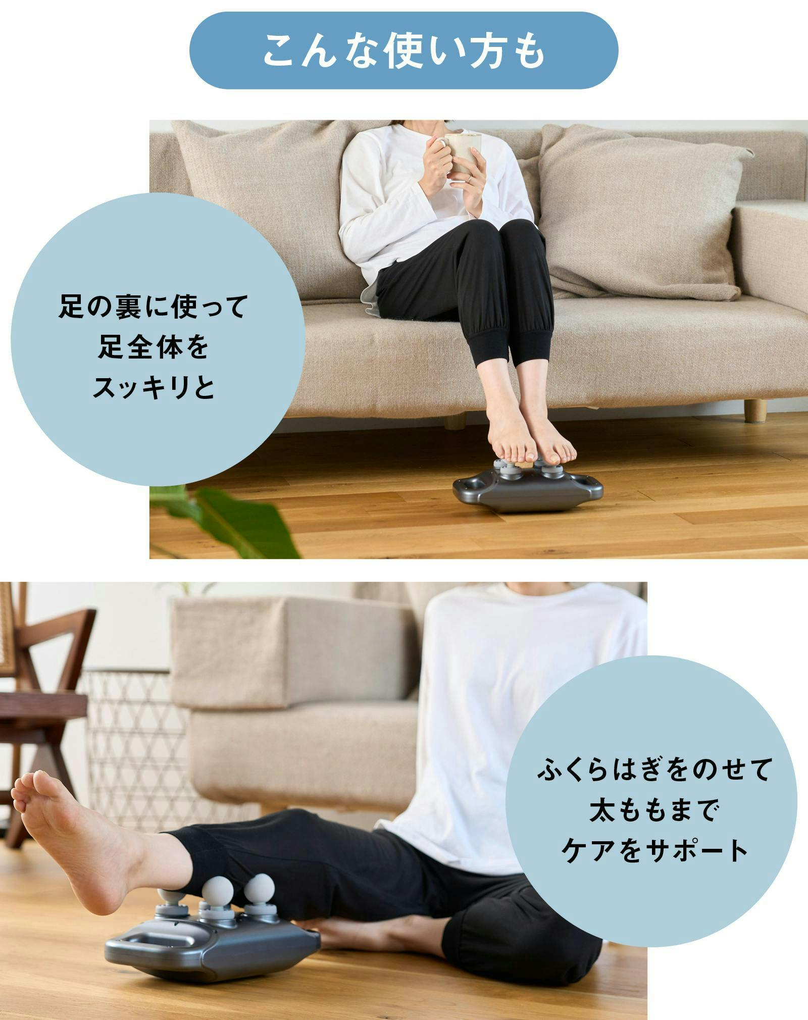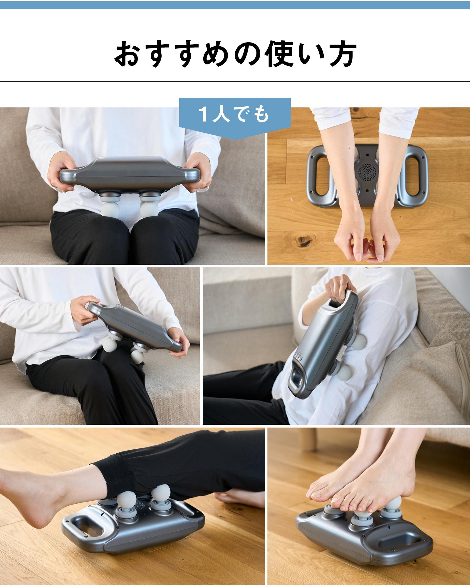 仕事や家事を終えた後、負担を感じた身体をすぐにケアして、心も穏やかにしたい。 そんなお役に立ちたいと願って開発されたこの製品は、様々な振動で足の裏やふくらはぎ、腰、背中などをケアします。