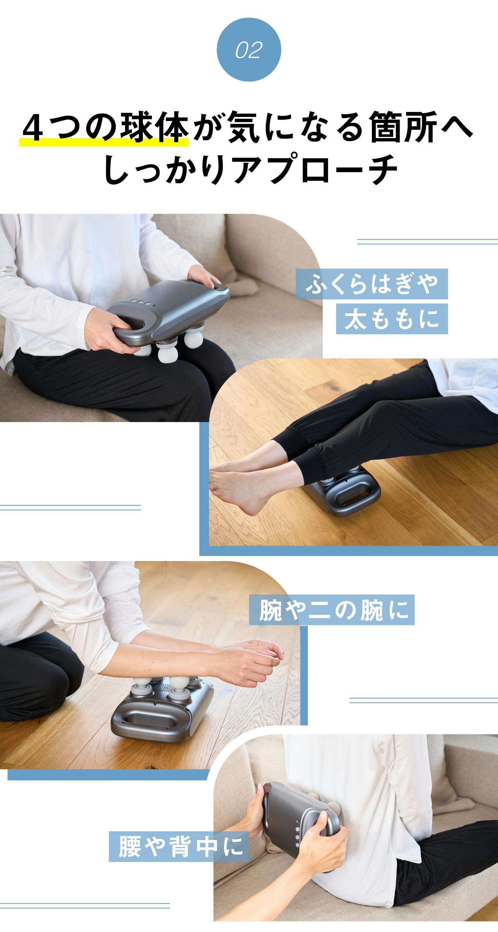 特徴的な4つの球体は、体の様々な部位にフィットするデザインとなっています。複雑な形状の体の凹凸にもしっかりと当たり、均一なケアをサポートします。足の裏やふくらはぎ、腰や肩、お腹など、気になる箇所を選ばずにアプローチできるのが魅力。ジェットバスに浸かっているような心地良い体感を得ることができます。