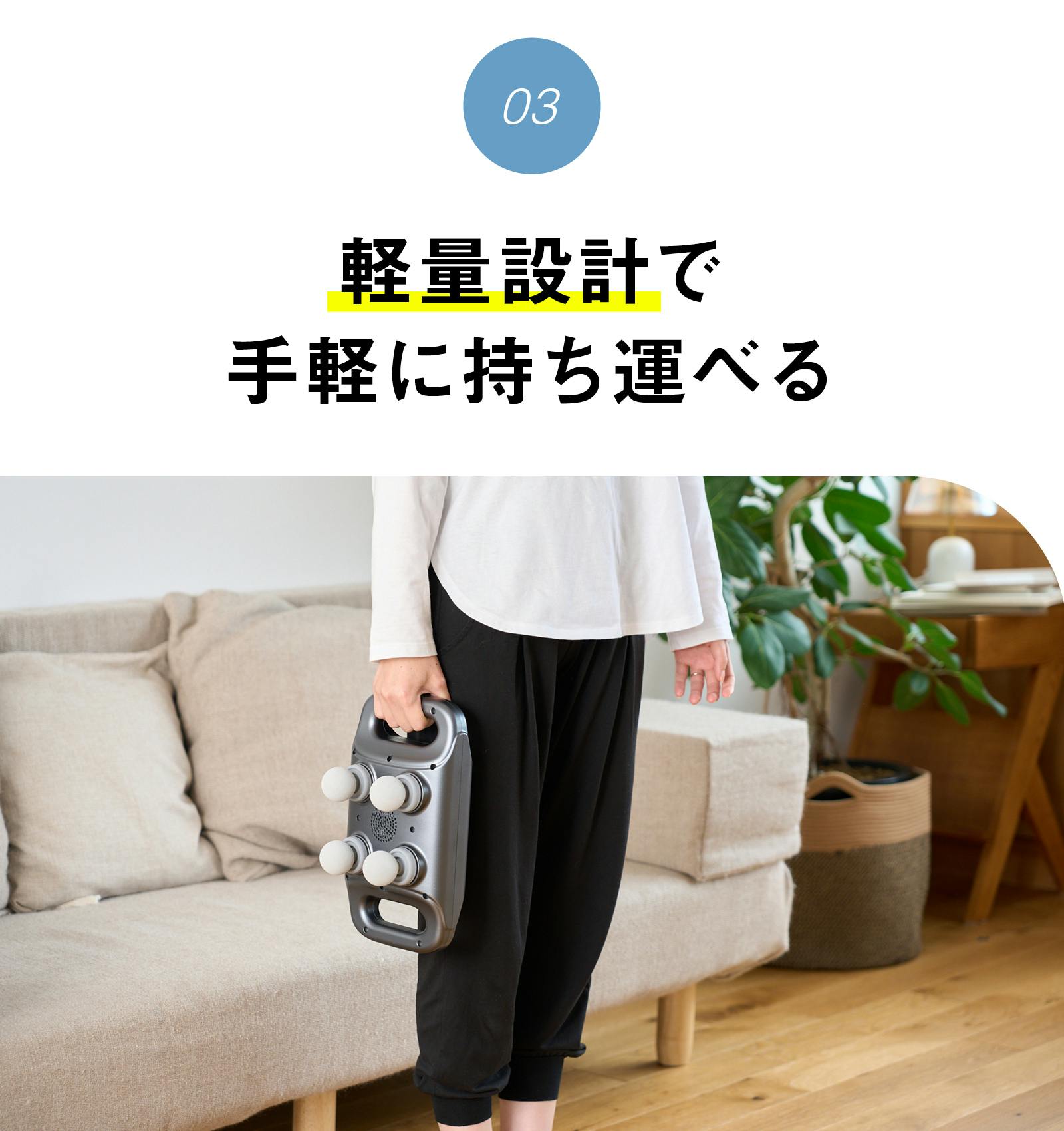 この製品は軽量設計となっており、リビングから寝室、キッチンから書斎まで、場所を選ばずに手軽に持ち運びながらのケアが可能です。重さを気にせず、どこへでも気軽に持ち運んで、お好きな場所と時間でのケアを実現します。
