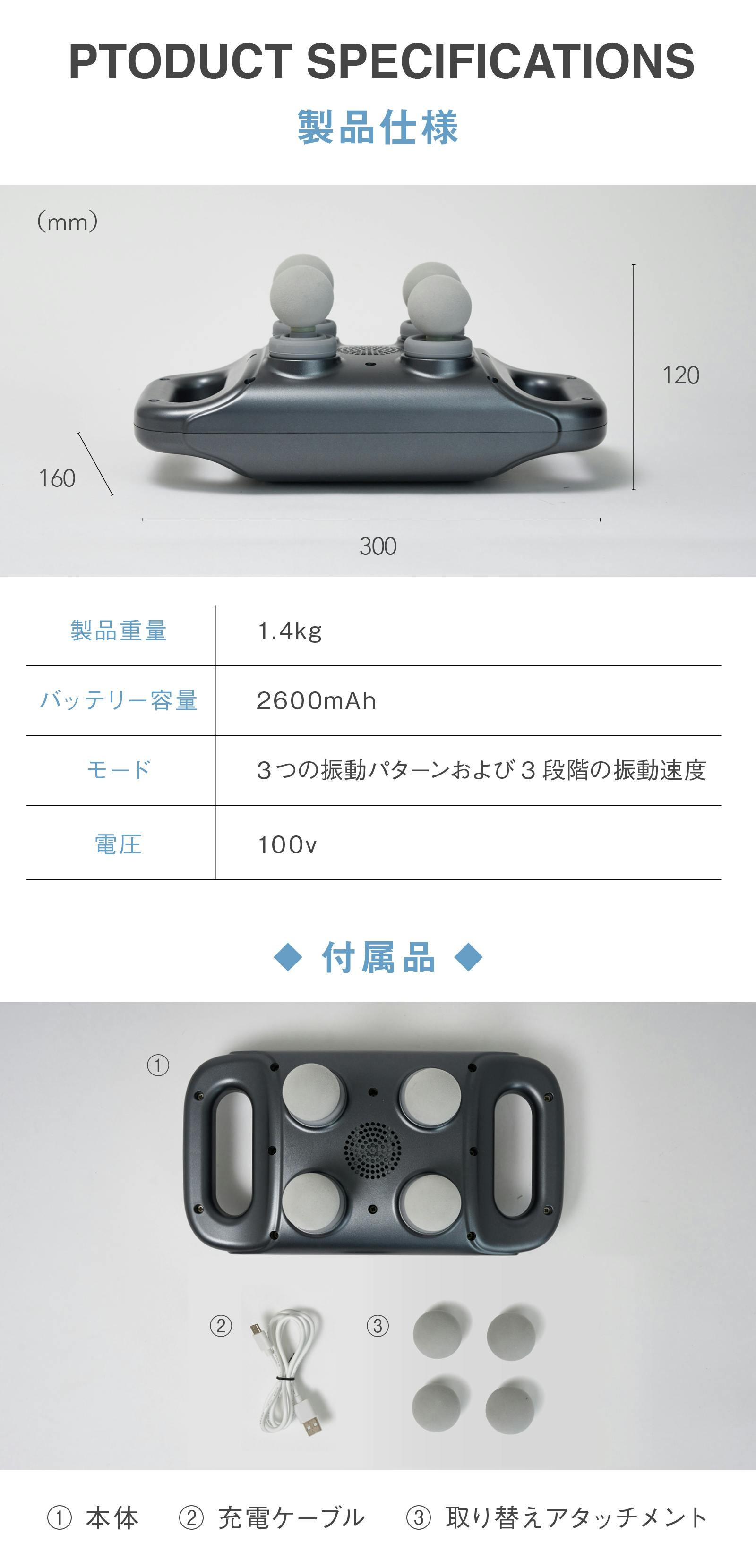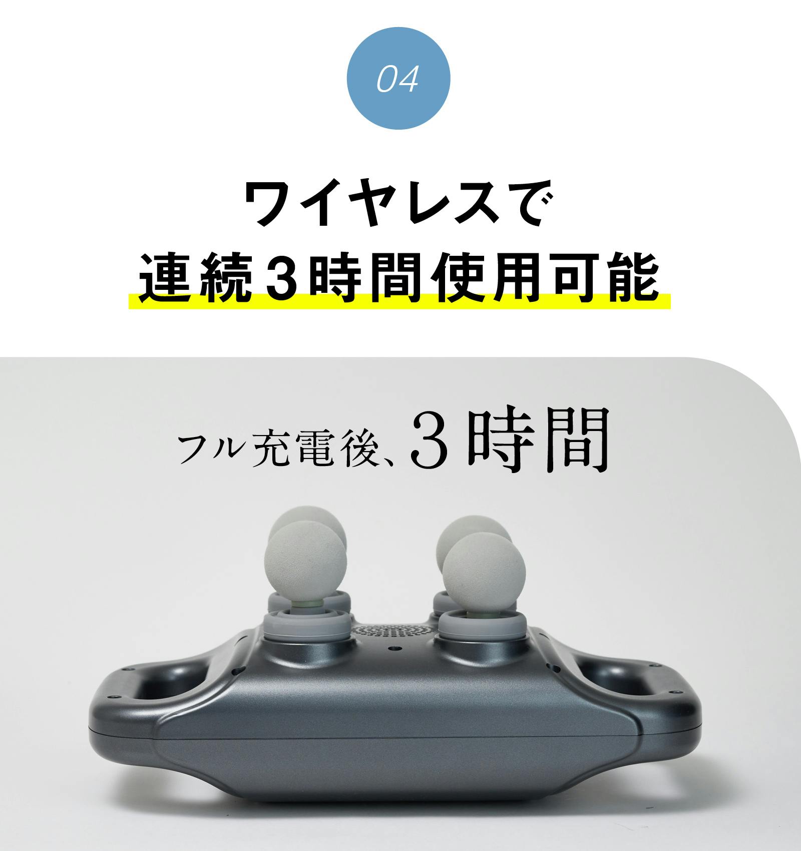 この製品は、4つの球体が高速で振動し、お好みに合わせて選べる3種類の振動パターンと3段階の振動速度で、体の気になる箇所へしっかりとアプローチします。