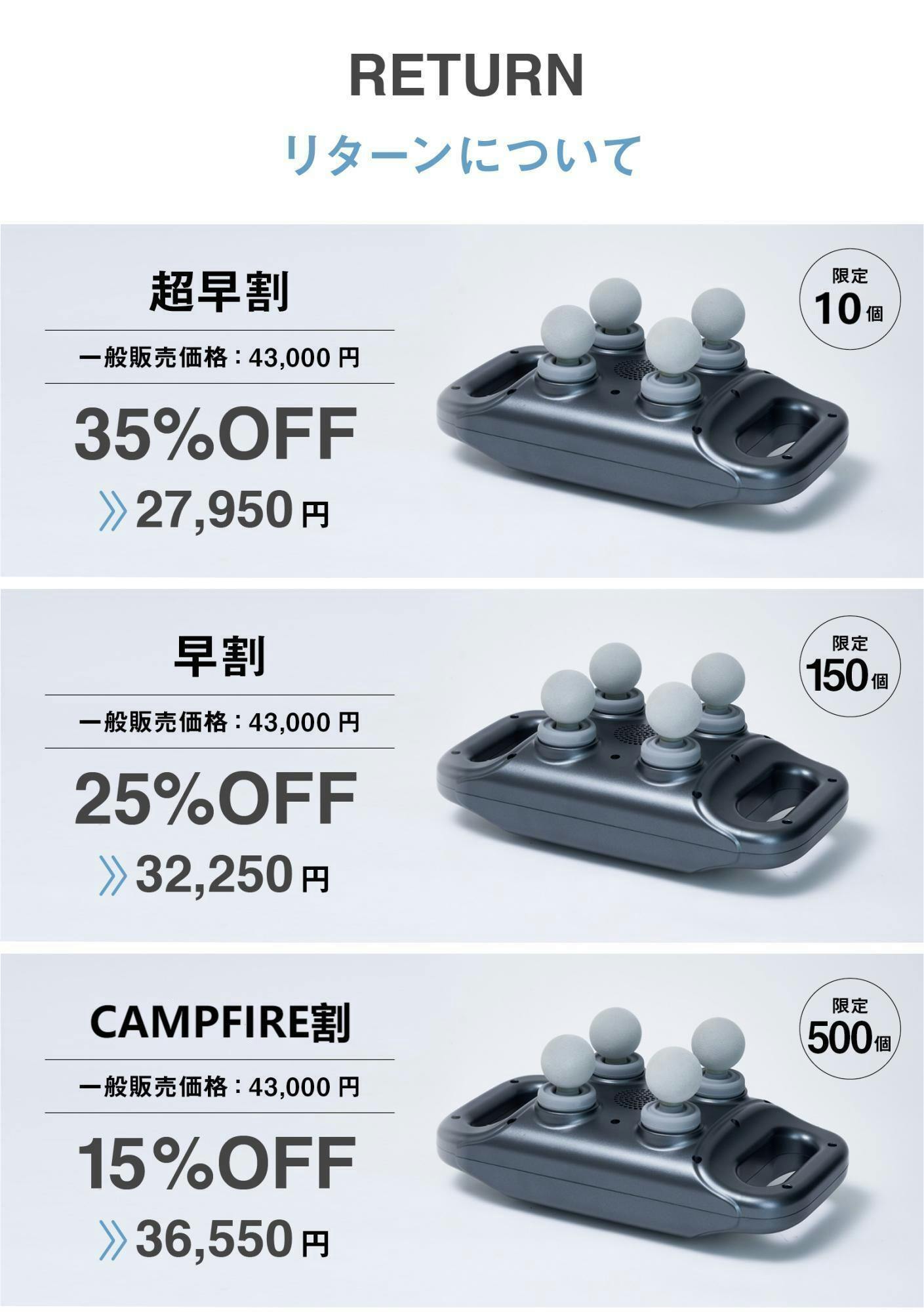 ※本プロジェクトを通して想定を上回る皆様からご支援を頂き、現在進めている環境から量産体制を更に整えることができた場合、正規販売価格が販売予定価格より下がる可能性もございます。本文中に記載させていただいたスケジュールは、あくまでプロジェクト公開時点の予定です。プロジェクトの性質上、配送遅延のおそれがございます。以上の注意点につきましてあらかじめご理解とご了承いただいた上でご購入くださいますよう、よろしくお願い申し上げます。