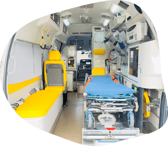 高規格のハイエースです。車椅子に乗ったまま、リフトで乗車できます。各種医療器材や観察資器材を積載。患者様の状態を継続的に観察(脈拍、血圧、SpO2(血中酸素濃度)など)し、適宜医療処置(酸素投与、喀痰吸引など)が可能です。ハイメディックに比べ走行性能が高く、小回りも効くため、住宅街でも走行可能です。感染対策も万全に講じられています。