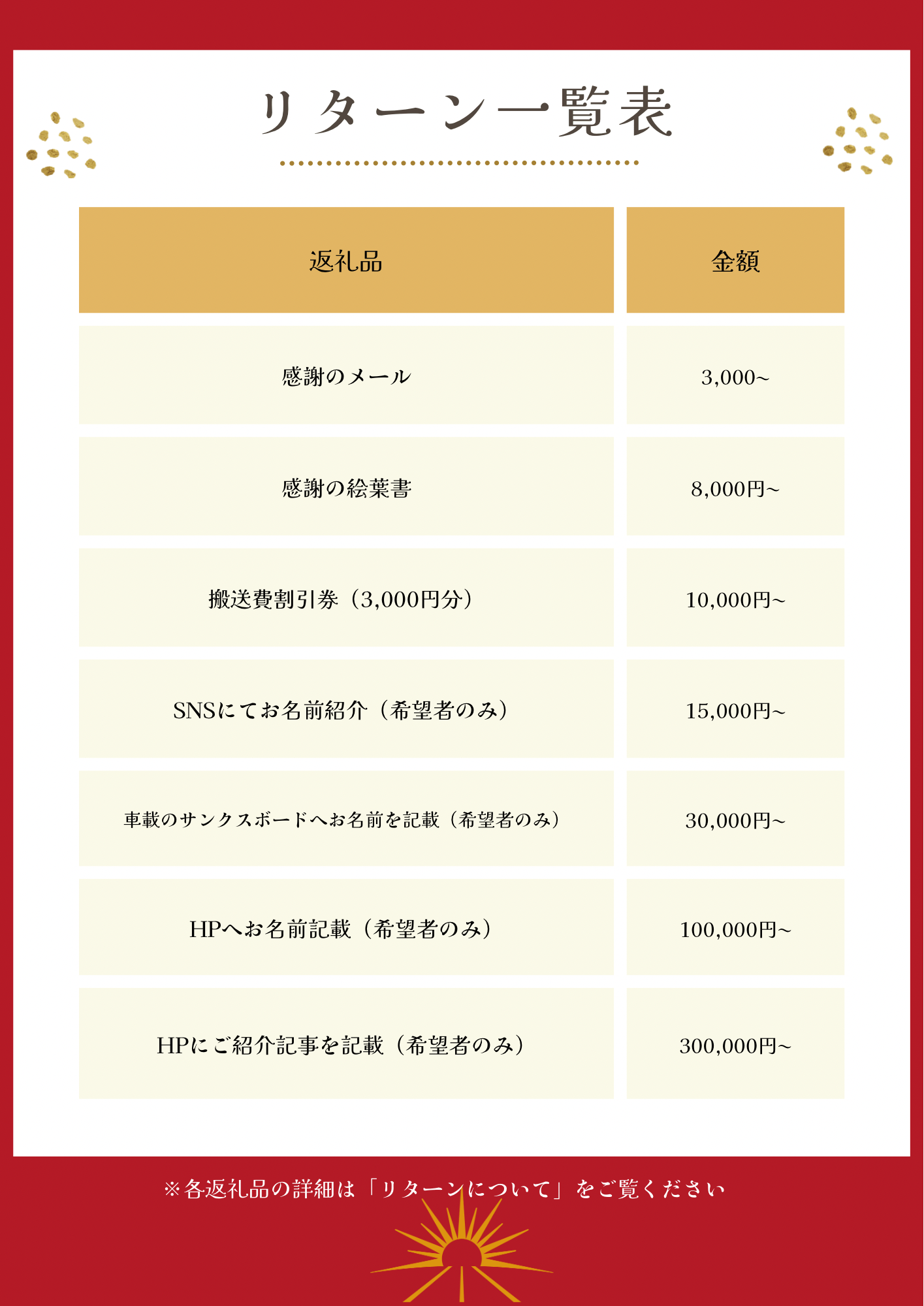Sun Roadの福祉車両購入プロジェクトにご支援いただいた方々には、心からの感謝を込めて特別なリターンをご用意しています。