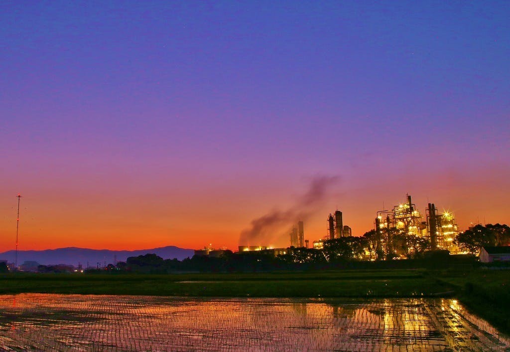 朝焼けに染まりつつある空と、工場の機械的な光、たなびく煙、水田に移る工場の光がステキですね。