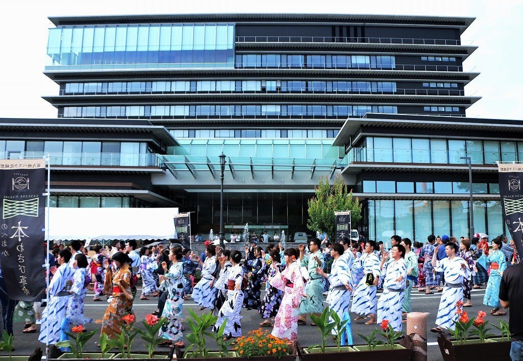 タイトルからも分かるように、延岡市役所新庁舎完成(2016年11月)後初となるばんば総踊りでした。浴衣姿の男女の踊る姿と、青を基調とした新庁舎が夏の祭りのイメージにピッタリですね。