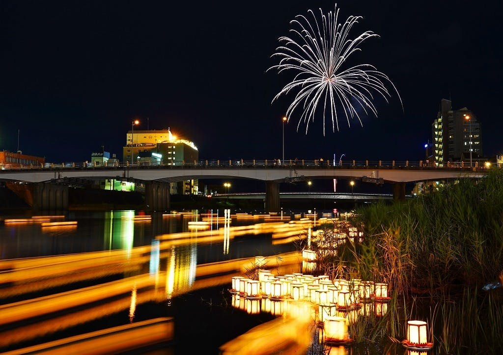 祭事の最後には、花火も打ち上げられますが、川の流れや風の影響で川面を動く灯籠の光と花火のコラボレーションが素晴らしい作品ですね。