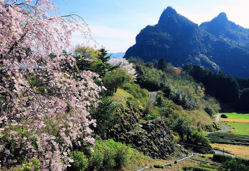 確か、中川集落(日之影町)のチューリップ畑を撮影に帰り道だったと思いますが、そのお宅の庭園入口にある桜がとても綺麗だったので、綱の瀬川を挟んで対岸にある矢筈岳をバックに写真を撮らせていただいた次第です。