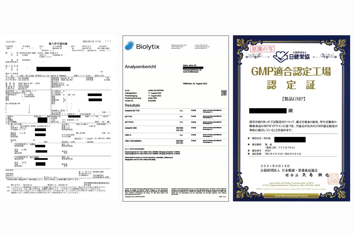 スイスより空輸便にて輸入されたCBD原料および国内製造について各種証明書を発行いたします。