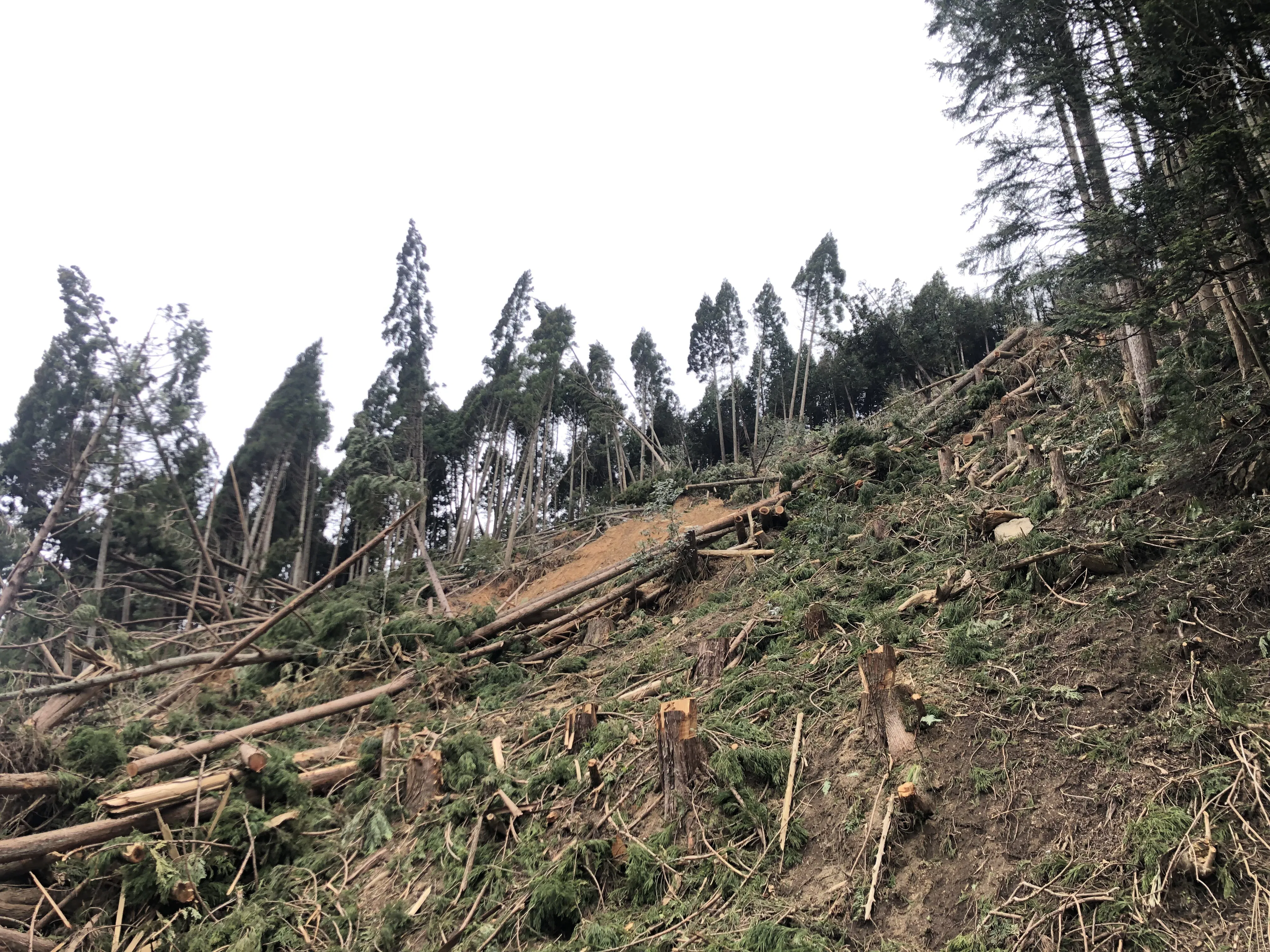 このような現場では、人手不足から普段は主に造林や育林に携わる方々が、伐倒や搬出の慣れない仕事に従事していらっしゃいます。この日も「伐倒の現場は2回目」という若者がいて、慣れない上に普段よりずっと危険な作業に「緊張の連続で疲れる」「怖い」と言っていました。