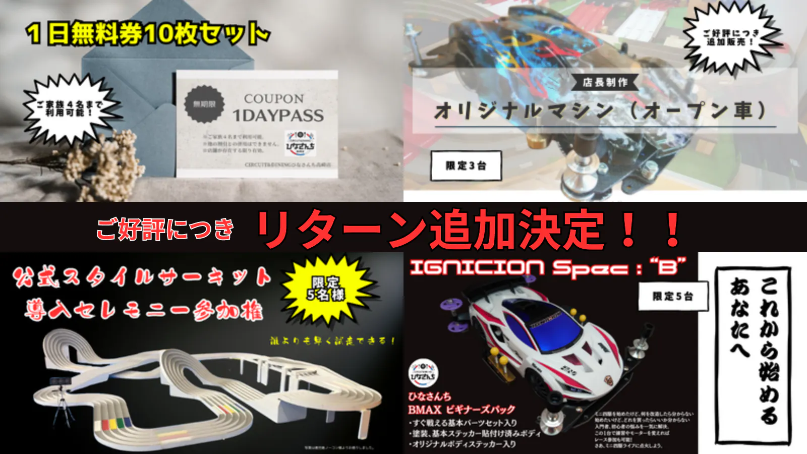 大盛況のため2022年に移転。「CIRCUIT&DININGひなさんち高崎店」としてリニューアルオープン。2023年には新潟県長岡市にのれん分け2号店「CIRCUIT&CREATEひなさんち長岡店」をオープン。2024年現在、より快適にミニ四駆を楽しんでもらうために拡大移転リニューアルを計画しています。