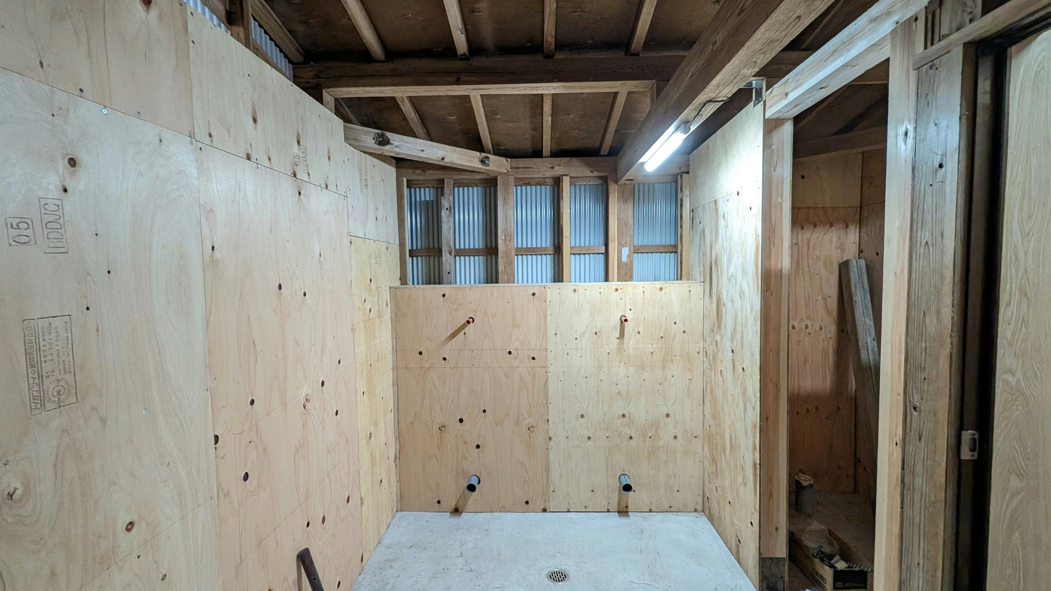 ついに男子便側、最後の下地を貼り終えました。建物がガタガタだったので、板を貼るだけでもかなり苦労しましたが、なんとかここまでたどり着きました。