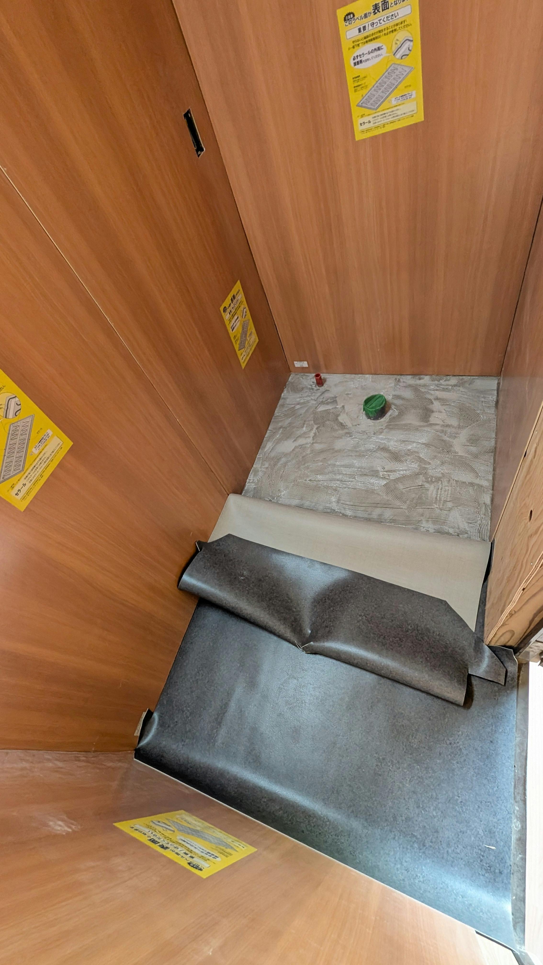床を貼ります。今回Mioの会員さんでインテリア関係のお仕事をされている方が、分厚いクッションフロアを貼ってくださいました。
