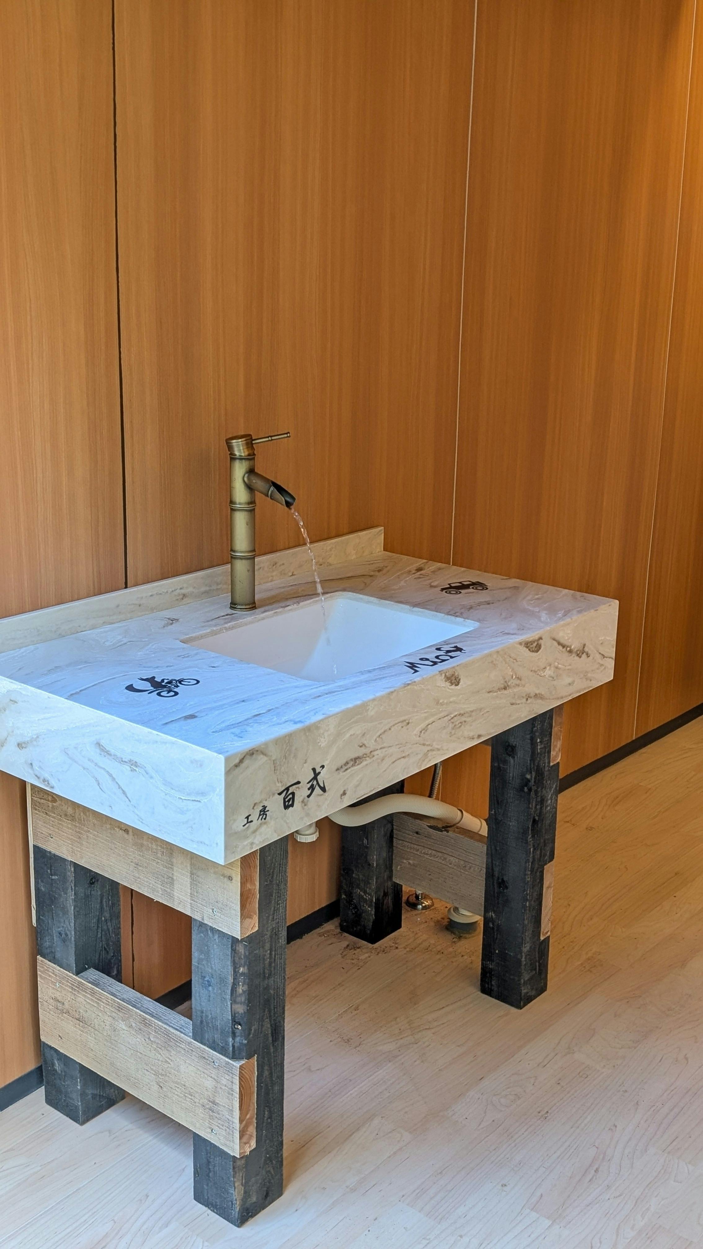 2024/08/20 14:00手洗い場を取り付けました。天板は工房「百式」さんに人工大理石で作っていただきました。Mioのロゴ入り特注品です。蛇口部分はオシャレな竹っぽいモノを付けております。ネットで中華製の安いのを探しました。 もっと見る