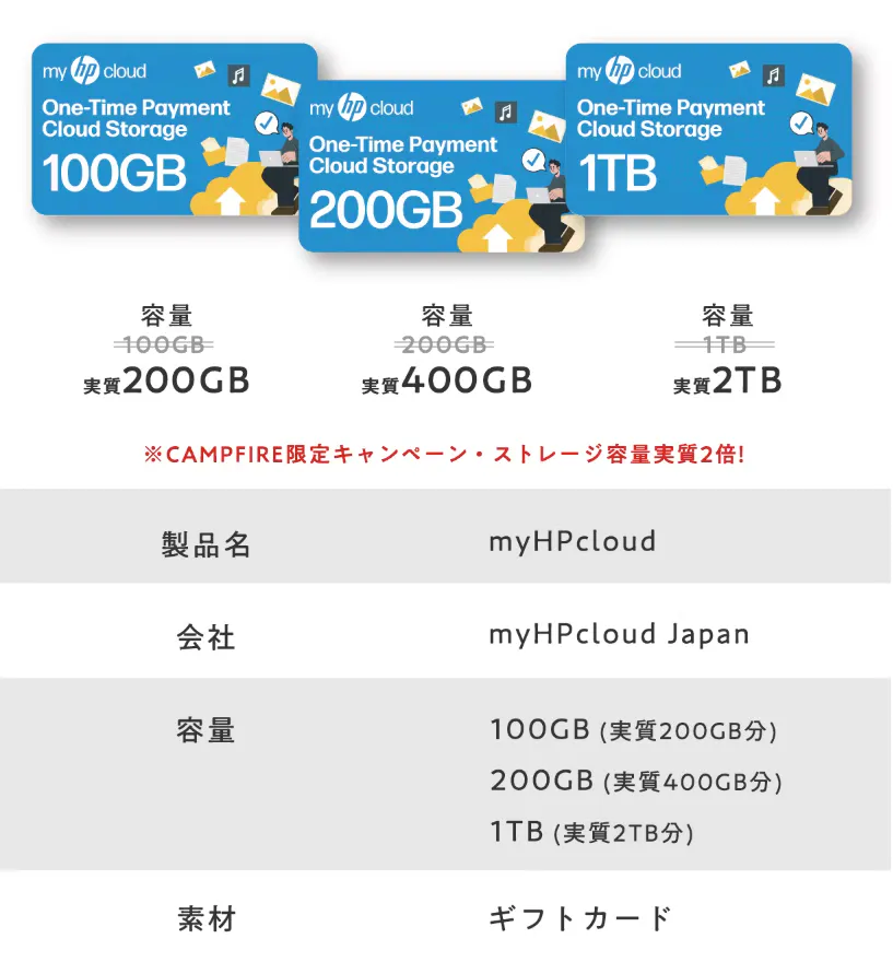 2025/08/29 10:00サポーターの皆様へいつもご愛用いただきありがとうございます。「買い切り型クラウドストレージ myHPcloud」に、待望の新商品が登場しました!本日 8月29日(金)12:10 〜 公開スタート バイバイ生涯サブスク!買い切り型クラウドストレージ大容量3TB・5TBが初登場!たっぷり保存したい方に最適な【3TB】&【5TB】プラン・Campfireにて先行予約販売を開始します。・さらに、各リターンには 追加容量の特典 をご用意。今回だけの限定チャンスです!公開通知を受け取るには、ぜひ 「お気に入り登録」 をお願いします。▶ 商品ページはこちらhttps://camp-fire.jp/projects/810211/view?list=projects_popular皆さまの暮らしに、もっと安心と快適を。今回の新プランを、ぜひお見逃しなく!myHPcloud チーム もっと見る【リターン発送完了のご報告】