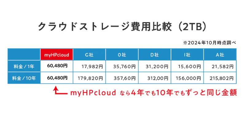 myHPcloudの最大の特徴は、生涯にわたるクラウドストレージの費用を圧倒的に抑えられる点です。