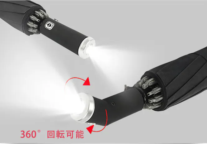 さらにライト部分を回転させて向きを変えることもできます。ぬかるんだ足元を照らしたり、車や家の解錠時に手元を照らしたり。視界が悪くなりがちな雨の日にライトがあると便利ですね。