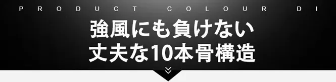 アルミ合金+グラスファイバーの強靭な骨を10本配置、強度はとても高く、豪雨、強風にも対応できます。