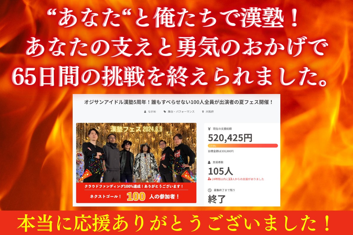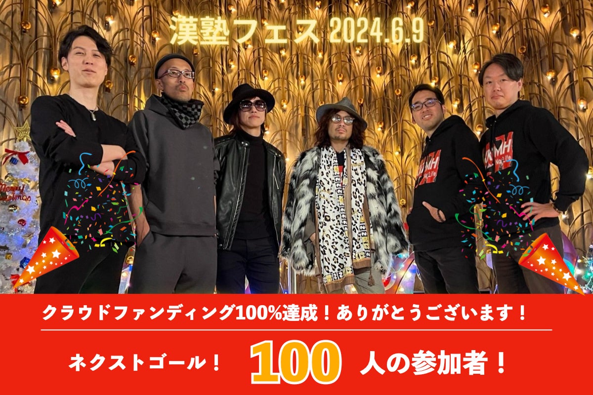 3月1日から65日間のクラウドファンディング終了しました。結成から6年、大きな大きなチャレンジでしたが、あなたのおかげで最後まで走り切ることができました。あなたからいただいた支援・応援・エネルギーを循環させ、6月9日を最高の1日にしていきたいので、引き続きお力を貸してください。会場に来れる人も、来れない人も、あなたと俺らで漢塾!!!!!いくときはー!一緒だよー!!漢塾メンバー 一同プロデューサー平原