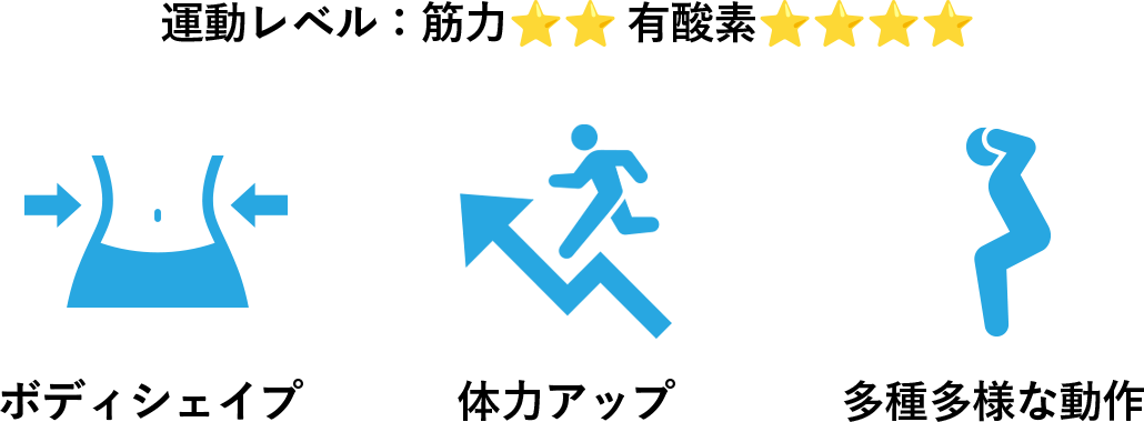 脂肪燃焼を目的とした有酸素運動と筋力トレーニングを交互に行うサーキットプログラム。有酸素運動ではランニング、ローウィング、バイク、縄跳びなどを行い、筋力トレーニングでは、軽めウエイトを扱い様々な動きで身体に刺激を入れていきます。脂肪もストレスも燃焼し、一回のトレーニングで1000kcal燃える人も!身体も心もスッキリすること間違いなしです。