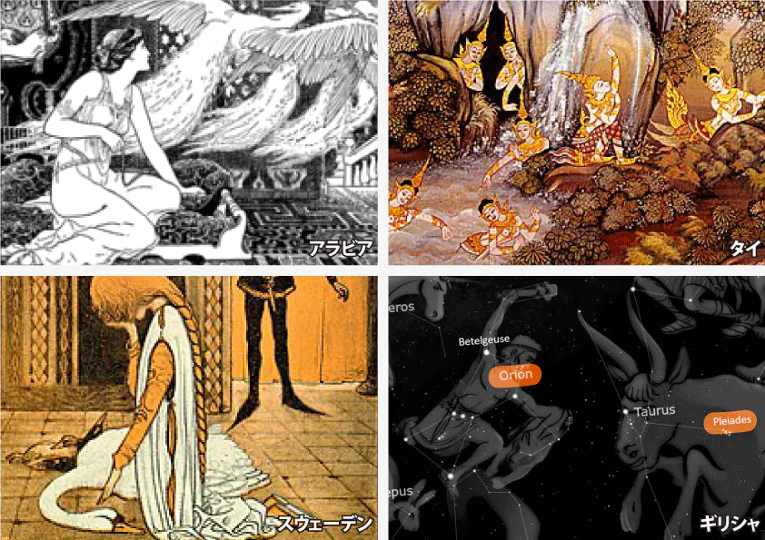 同様の物語はアジア・ヨーロッパ・北米・南米の広範囲に伝わっており、世界では「白鳥処女説話/SWAN MAIDEN」系として知られています。若い男女の物語ですが、世界各地に合わせた形で展開が改変(ローカライズ)され、その土地に残る伝承として伝えられてきました。