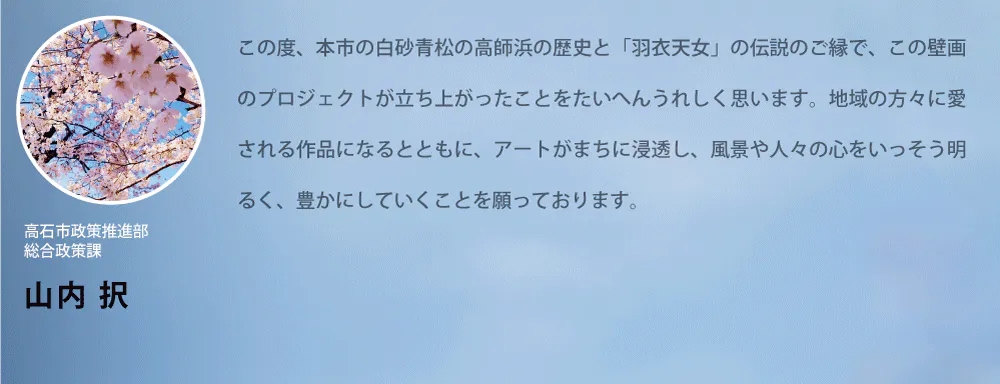 南海電気鉄道の高師浜線リニューアル運行に合わせて、2箇所で壁画を描きます。古くは沿岸部の美しさから景勝地として栄え、三大名松のひとつに“羽衣の松”がありました。